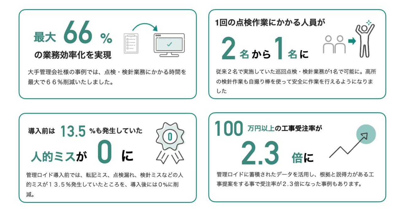 2019年11月に製品版をリリースしてから2022年6月までの間に、大手不動産管理会社を含む1,450社以上にご利用いただいており、導入済みの企業の中には「最大で66%業務が削減できた」、「1回の点検業務にかかる人員が半分になった」などのような事例もございます。