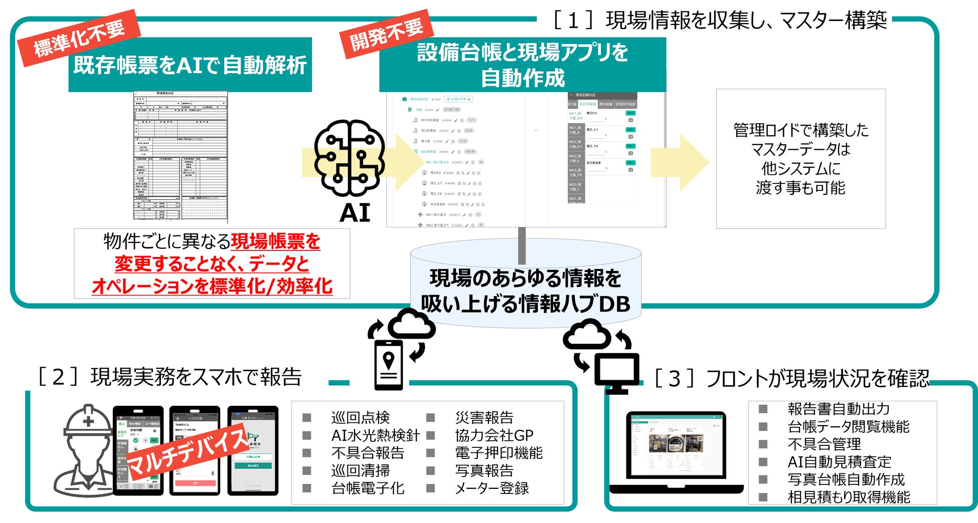 不動産管理の分野では、点検帳票、検針表、清掃報告書、不具合報告書、工事完了報告書など業務に応じて様々な報告書を作成する必要があります。これらの報告書は不動産オーナー、アセットマネジメント会社、プロパティマネジメント会社の指定帳票で業務を行う必要があり、帳票の標準化が出来ずにDXが進まない理由となっていました。
