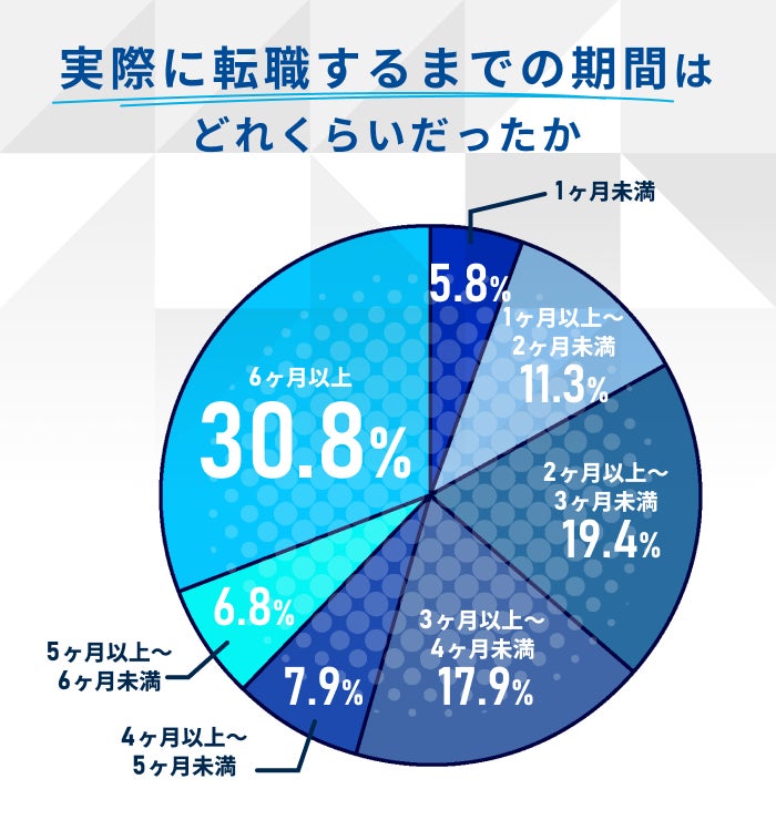一方で「1〜2か月未満(11.3%)」「1か月未満(5.8%)」といった短期間で転職が決まった人も一定数いました。これは、タイミングよく希望に合う求人と出会えたケースや、事前に準備を進めていたケースなどが考えられます。