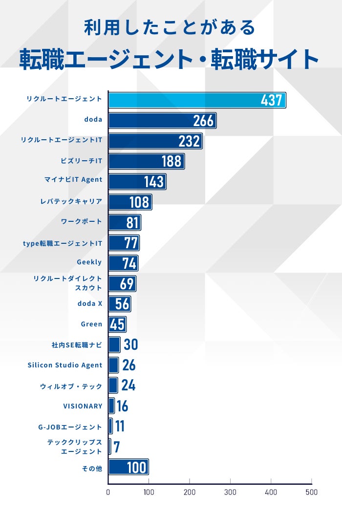 最も利用者が多かったのは「リクルートエージェント(45.3%)」でした。続いて「doda(27.6%)」「リクルートエージェントIT(24.1%)」「ビズリーチIT(19.5%)」が上位に入り、大手転職エージェントやスカウト型転職サービスが上位を占めていました。