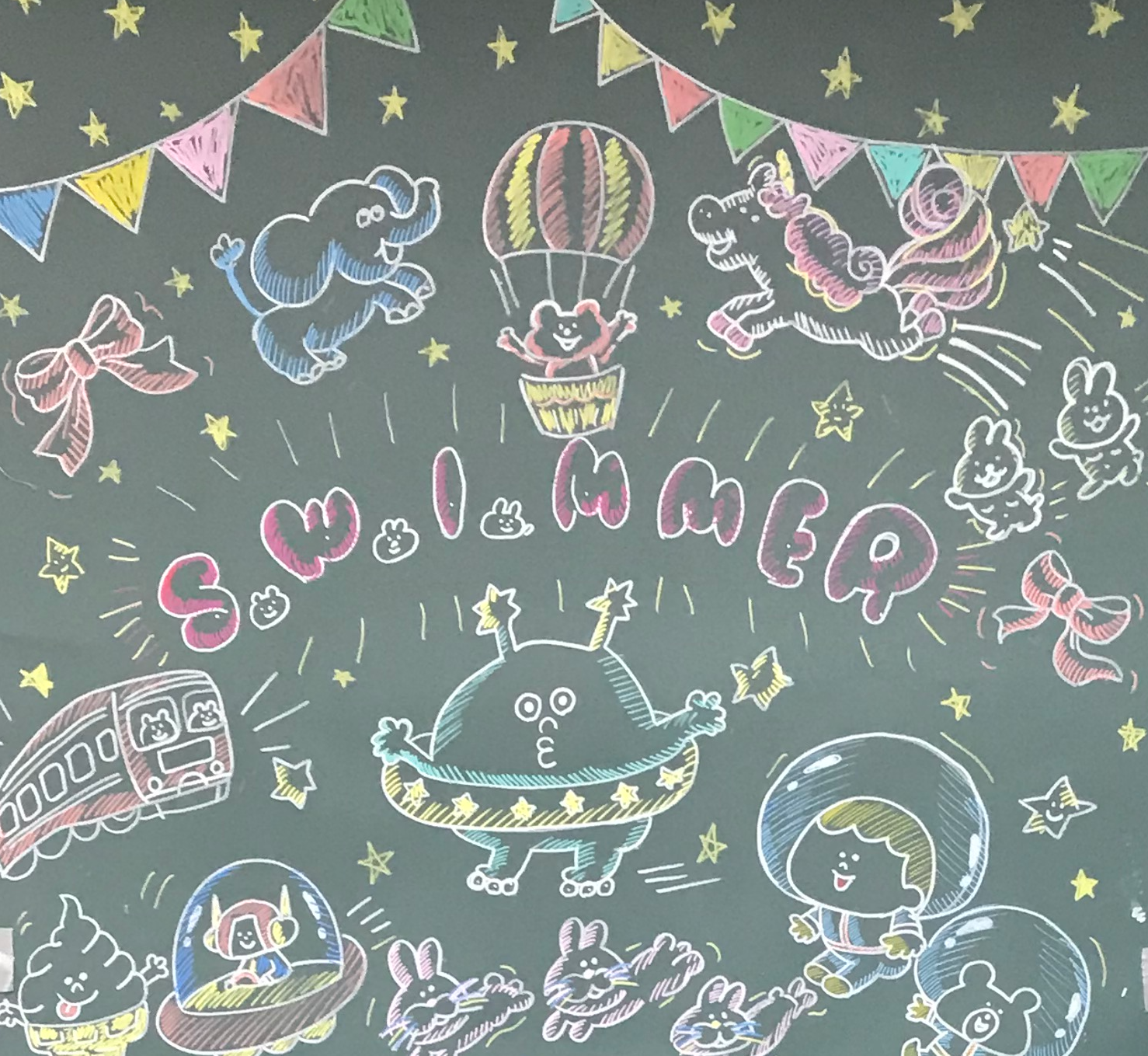 SWIMMERデザイナー「ひづめみか~る」さんによる、手書きの黒板アートや原画の展示に、
