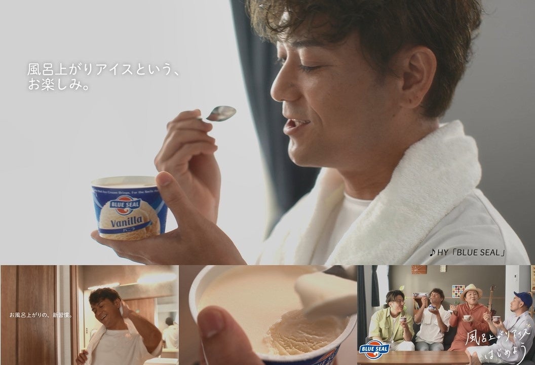「ブルーシールカップで風呂上がりアイスはじめよう!」をキャッチコピーとし、沖縄を代表するアーティストHYさんを起用した新TVCMを3月21日(月)より放映。お風呂上がりにブルーシールカップアイスを食べることで得られるリフレッシュ感をHY/HIDE(新里英之)さんの日常感あふれるセリフで表現しています。アイスをひと口食べる瞬間の「日常のご褒美感」を想起させる表情は必見です。BGMには今回のCMに合わせ新たに書き下ろしていただいたオリジナル楽曲「BLUE SEAL」を使用。HIDEさんのキャラクターと重なり明るく爽やかで、沖縄県民にはより親しみ深いイメージを醸成しています。