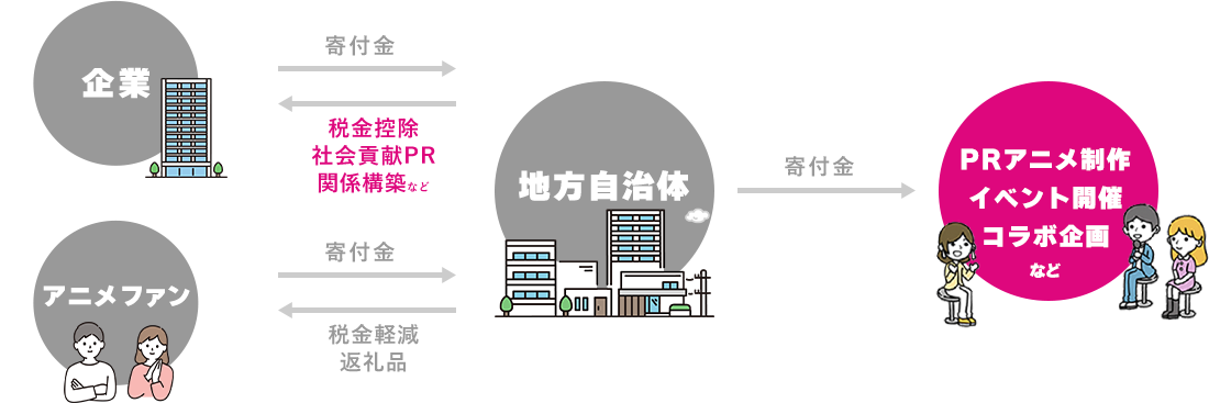 企業様にふるさと納税していただくことで、寄附を受ける聖地はもちろん、「ご参加いただく企業の皆様」「作品を愛してくださるファンの皆様」など関わる全ての方々が楽しめる企画を実施致します。