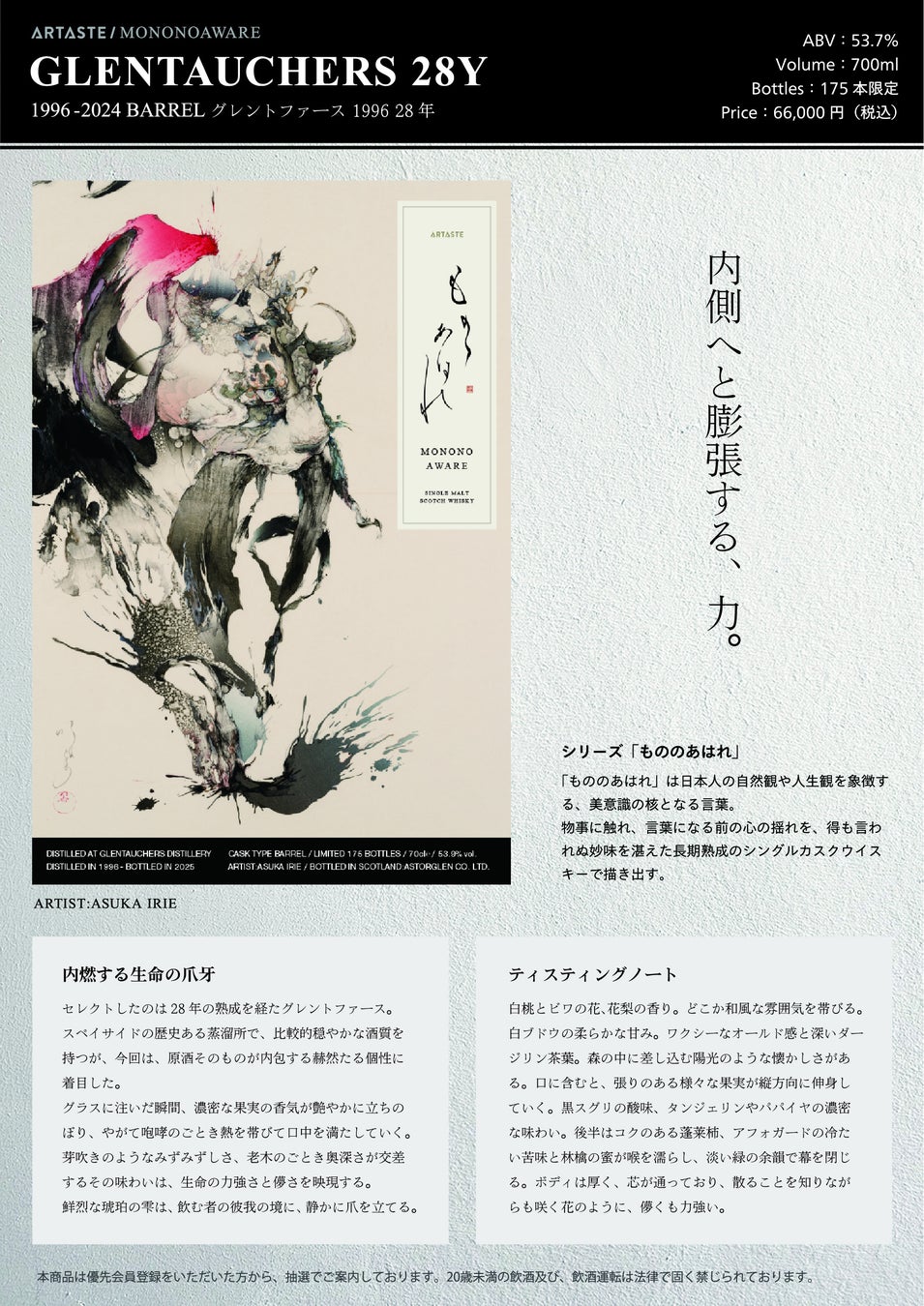 希少なシングルカスク×現代アートが交差する!アルテイストが、『もののあはれ』を冠したグレントファース28年を一般発売。ラベルアートは入江明日香。