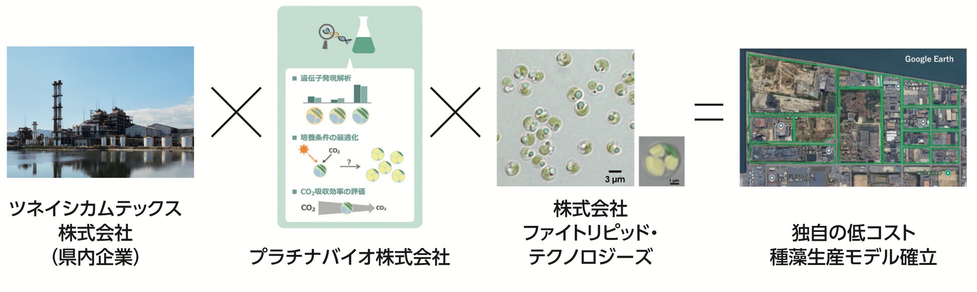 ツネイシカムテックス、ファイトリピッド・テクノロジーズ、プラチナバイオ、リバネスが連携し、排ガスを活用した「低コスト種藻」生産モデルを確立へ