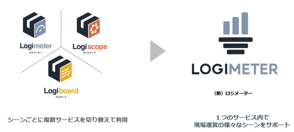 これまで多くの物流現場でご活用いただいてきた「ロジメーター」「ロジボード」「ロジスコープ」は、現場の可視化から分析まで、シーンごとに複数のサービスを切り替えて利用する必要がありました。