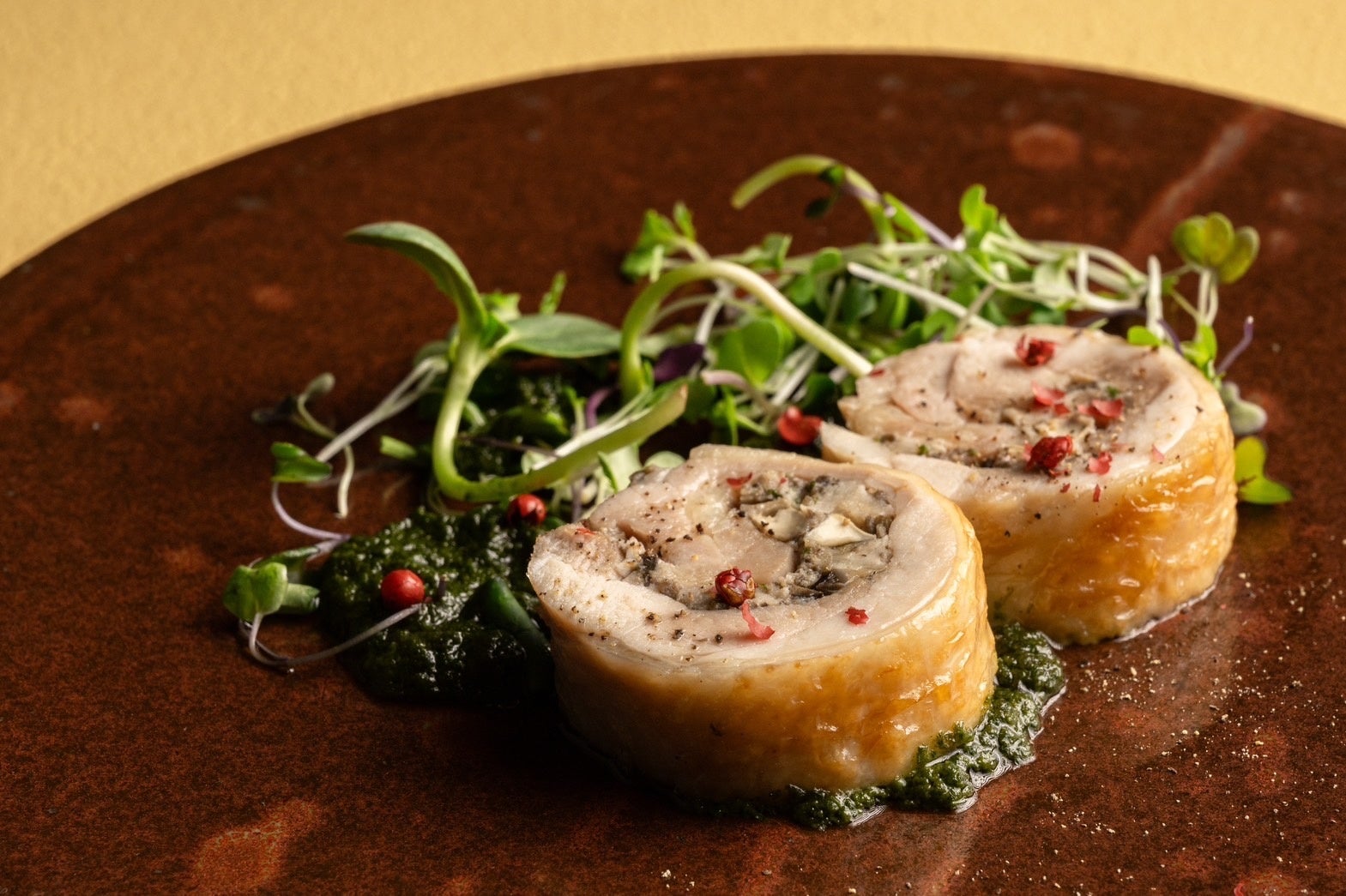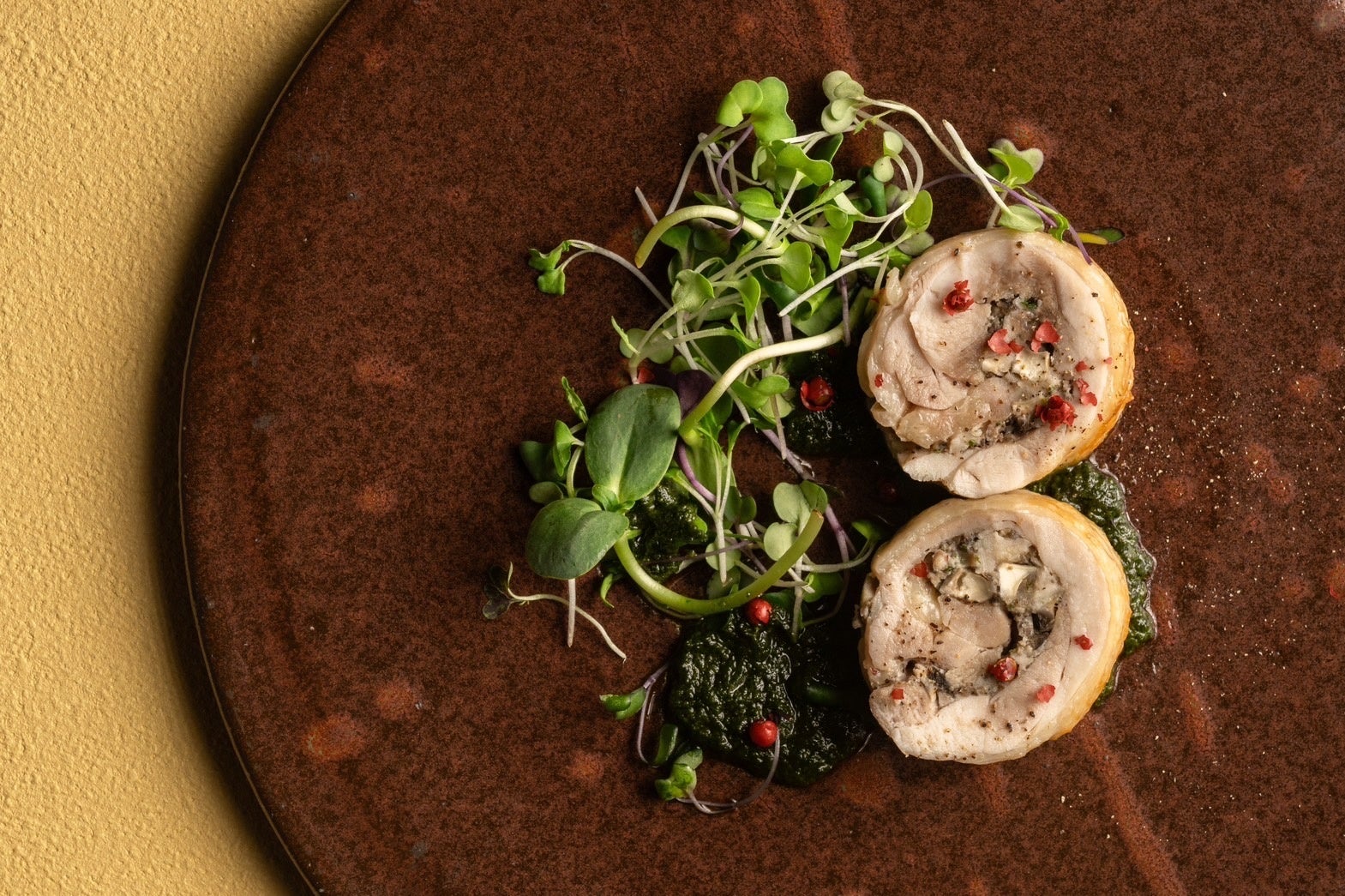 マッシュルームと鶏のガランティーヌ 春菊のソース