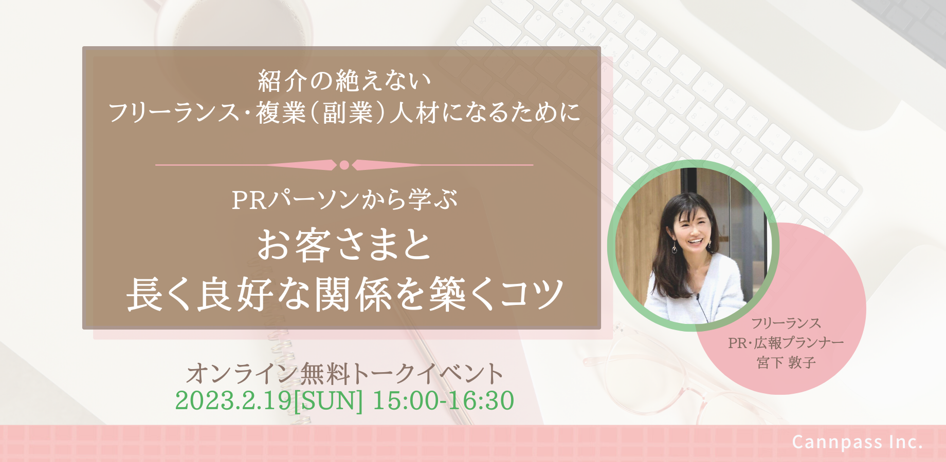 株式会社Cannpass(所在地:東京都渋谷区、代表取締役:山崎春奈)が主催する広報・PRプランナー&PRライター養成講座は、2023年2月19日(日)15時よりオンラインにて、お客さまとの信頼構築のヒントを学ぶトークイベント「紹介の絶えないフリーランス・複業(副業)人材になるために。PRパーソンから学ぶ、お客さまと長く良好な関係を築くコツ」を開催いたします。