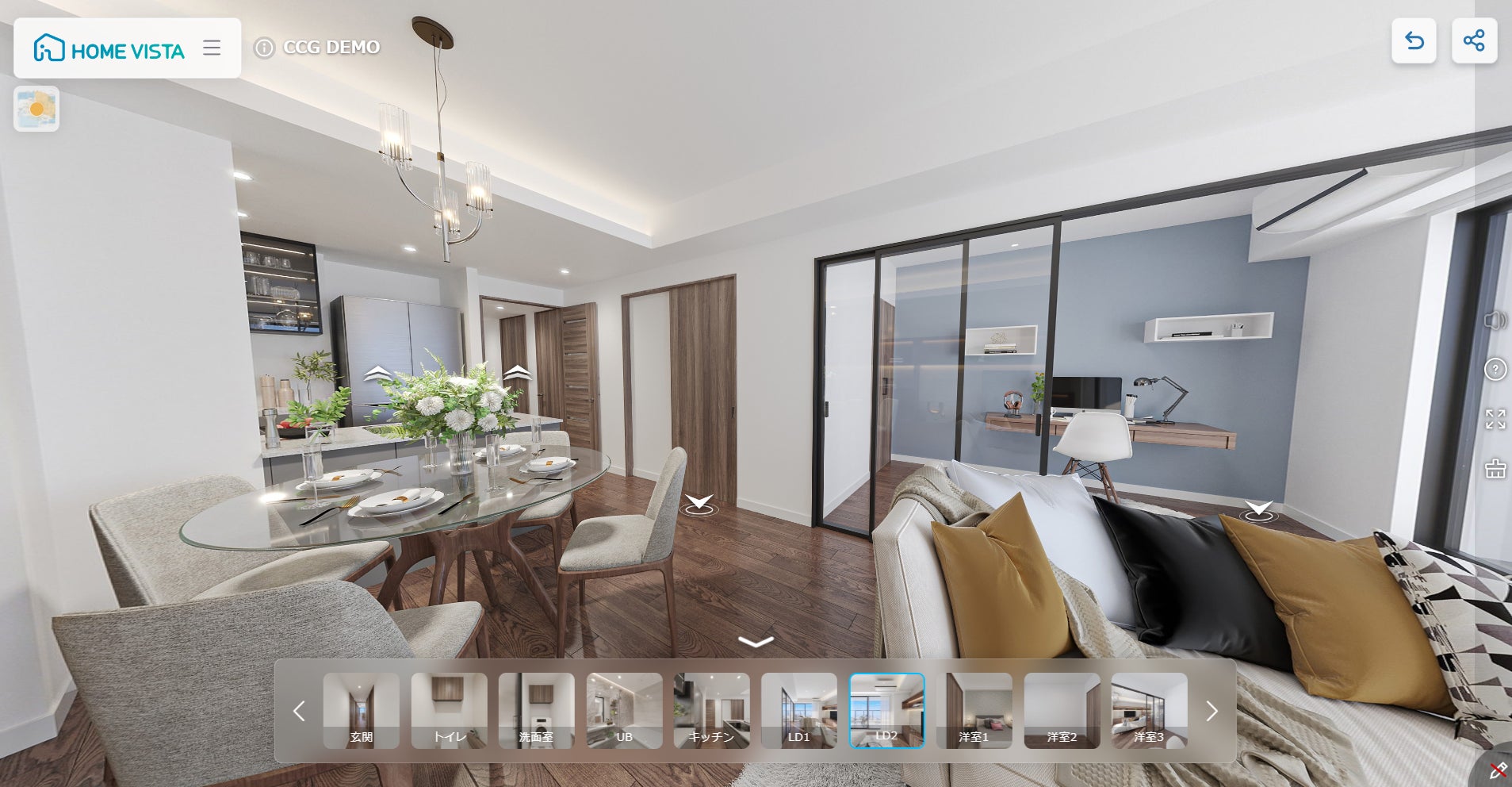 専有部から共用部まで幅広く物件の魅力をVRで表現します。またウォーク機能やVRから動画制作なども承っております。