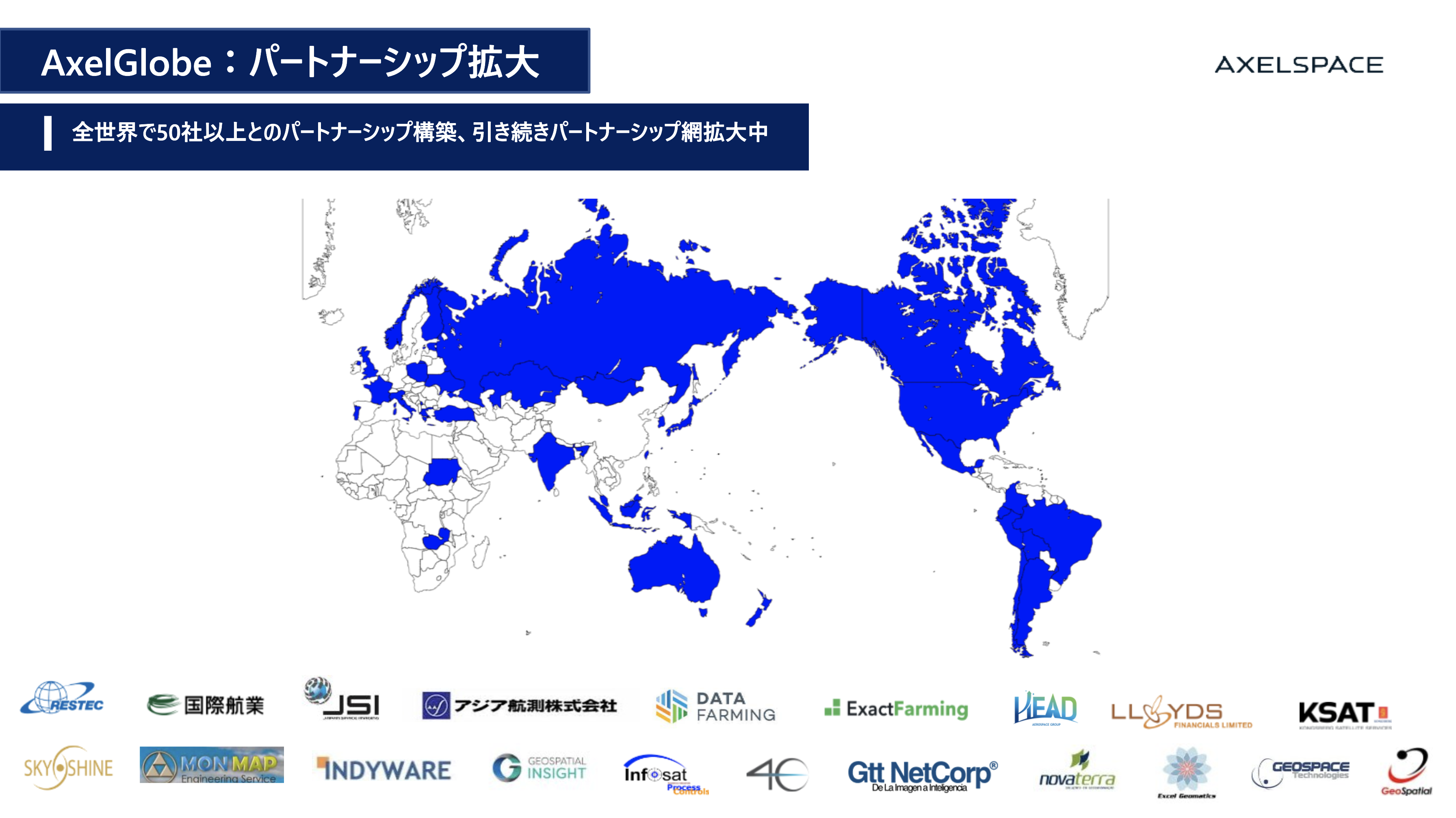 次世代地球観測プラットフォーム「AxelGlobe」は、2021年6月に衛星5機体制で新サービス「AxelGlobe Tasking & Monitoring」を開始して7ヶ月が経過し、売上は対前年比1,860%、販売パートナーシップは全世界で50社以上に拡大し、ほぼ全世界のマーケットをカバーしております。