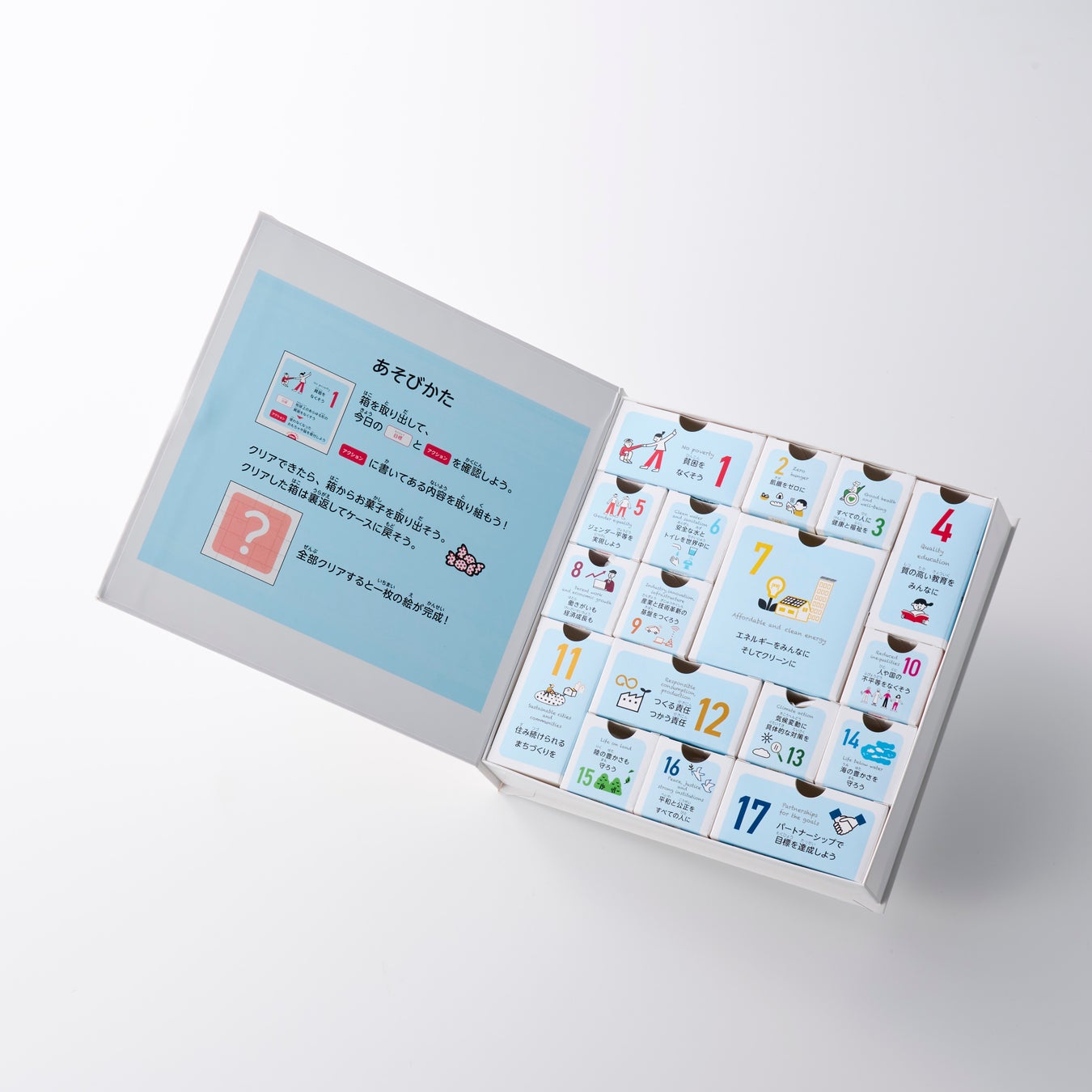 SDGsの17の目標を、大人も子どもも日常の中で実践できる“一日ひとつの行動”に落とし込み、アドベントカレンダー形式のパズルとして設計しました。