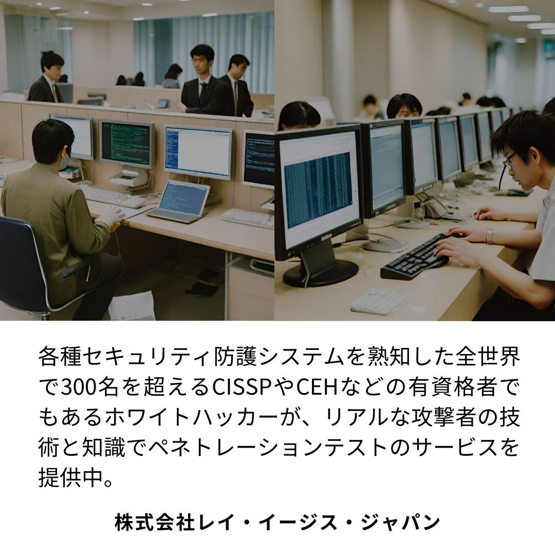 レイ・イージス・ジャパンのセキュリティエンジニアが、攻撃者に狙われやすいインターネットに面した機器を対象に、悪用できる脆弱性が露出していないか、 侵入が可能かのテストを行い、システムの脆弱性を明らかにします。これにより、お客様ご自身でセキュリティの強化に取り組む力を高めます。