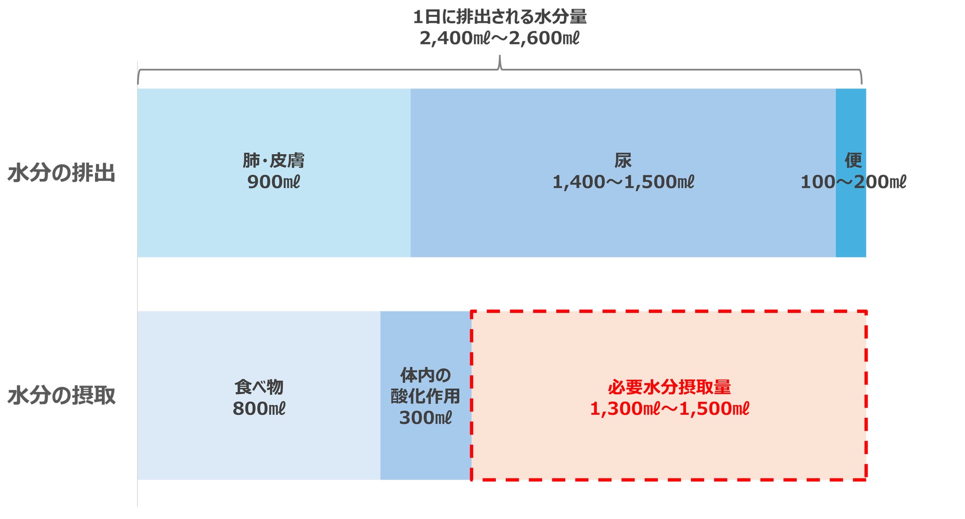 1日の水分の適切な摂取量は1.5ℓ~2ℓ程度がおすすめです。体内の水分を見ていくと、肺や皮膚から約900㎖、尿や便で約1.5ℓ~1.7ℓ程度が排出されるため、1日で約2.4ℓ~2.6ℓ程度が自然と失われていることになります。一方で水分を摂取する以外にも自然と体内に水が取り入れられるシーンがあります。食事で約800㎖、体内の酸化作用で約300㎖と言われているため、約1.1ℓは水分補給以外での水の摂取ができていると考えられます。