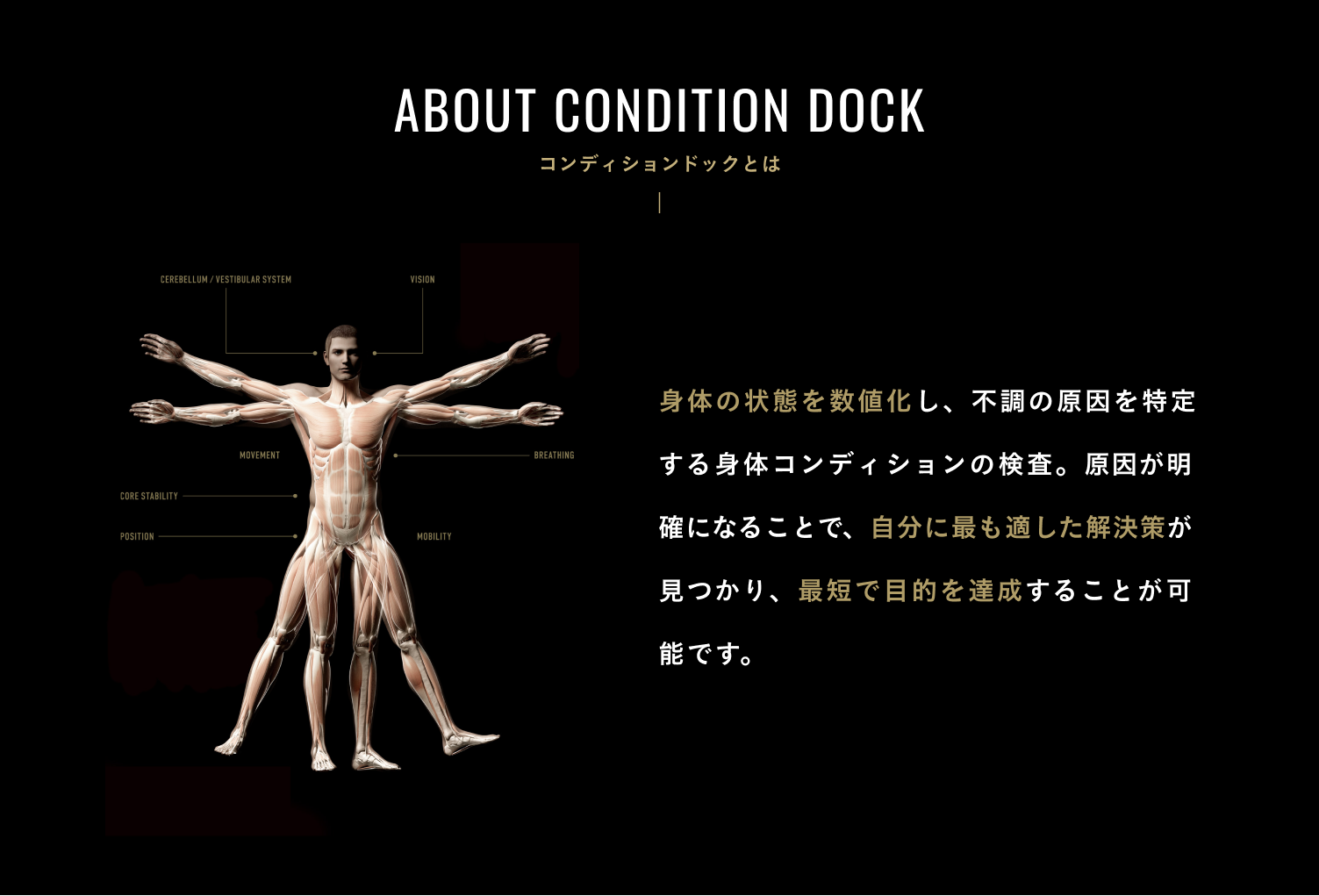 コンディションドックでは、呼吸、視覚、小脳など30項目以上の検査を実施し、現在の身体の状態をBODY IQとして数値化します。さらに、身体タイプを8つに分類し、改善のために適切なトレーニングを3ステップで紹介します。