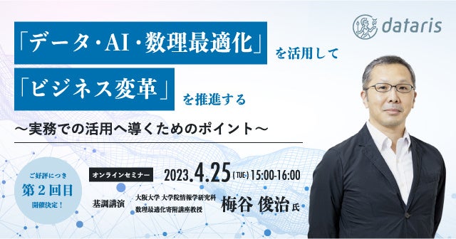 2023年4月25日(火)15時より、前回大変好評をいただいた、データとAIの活用によるビジネスを最適化する数理最適化セミナーを開催いたします。