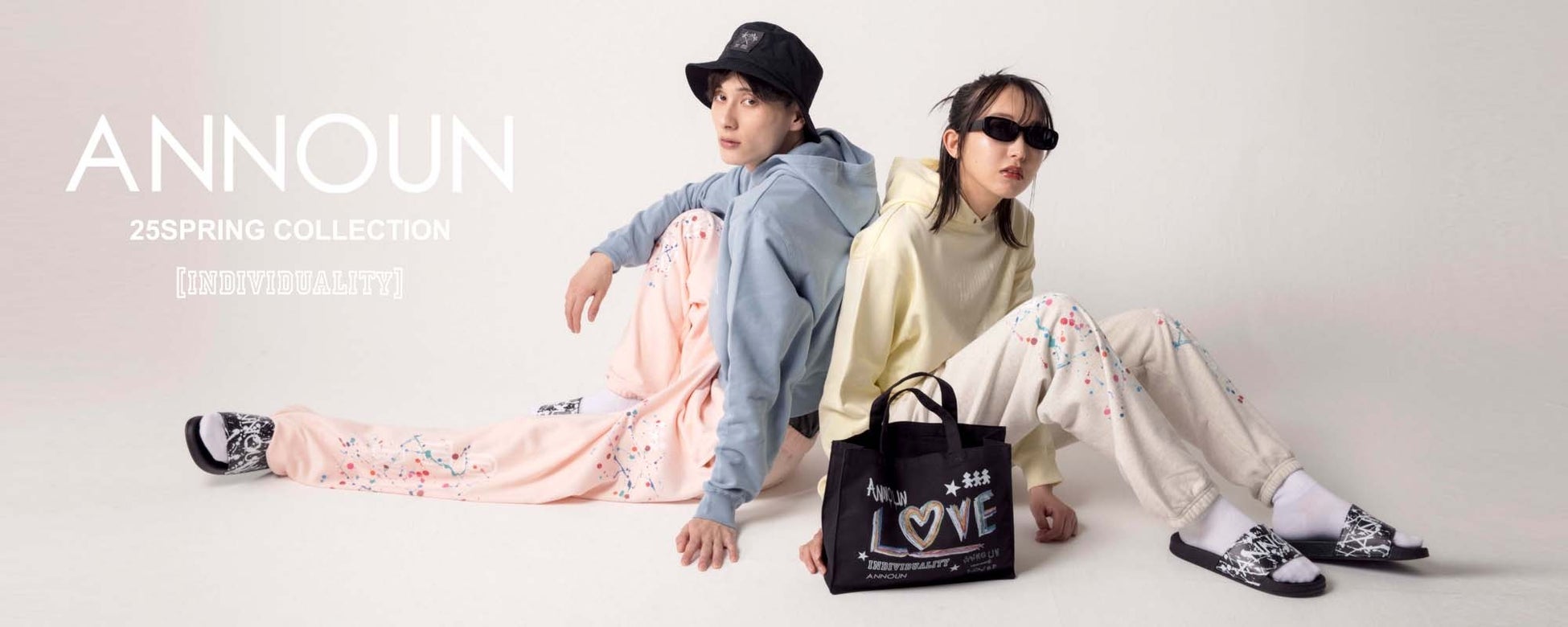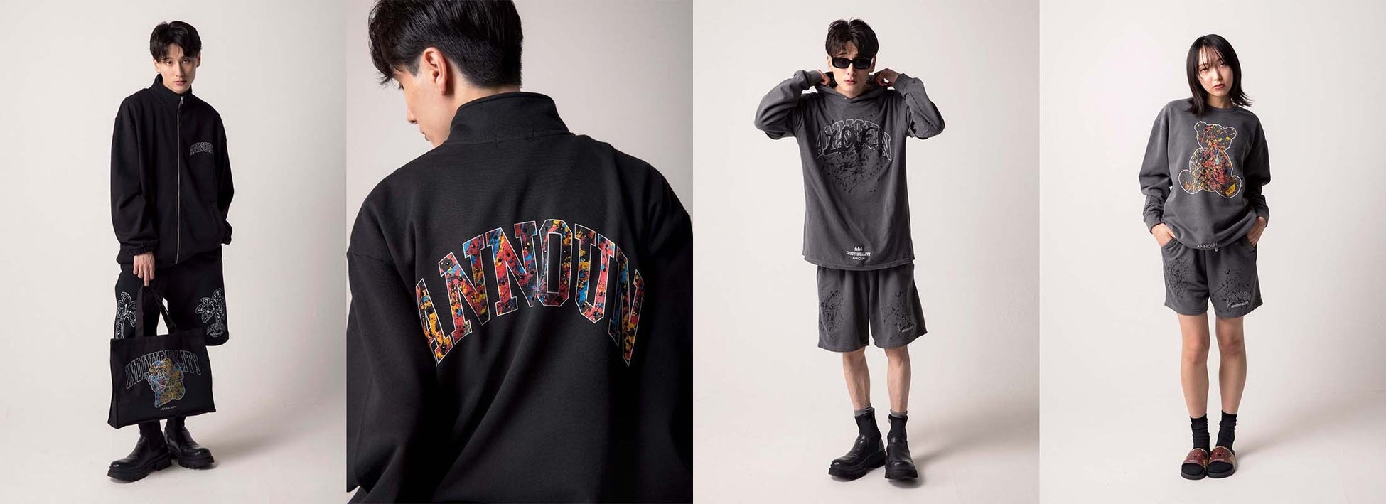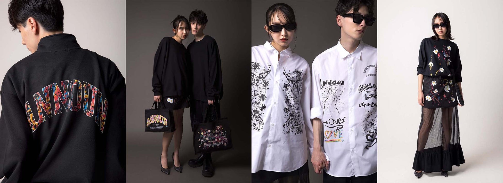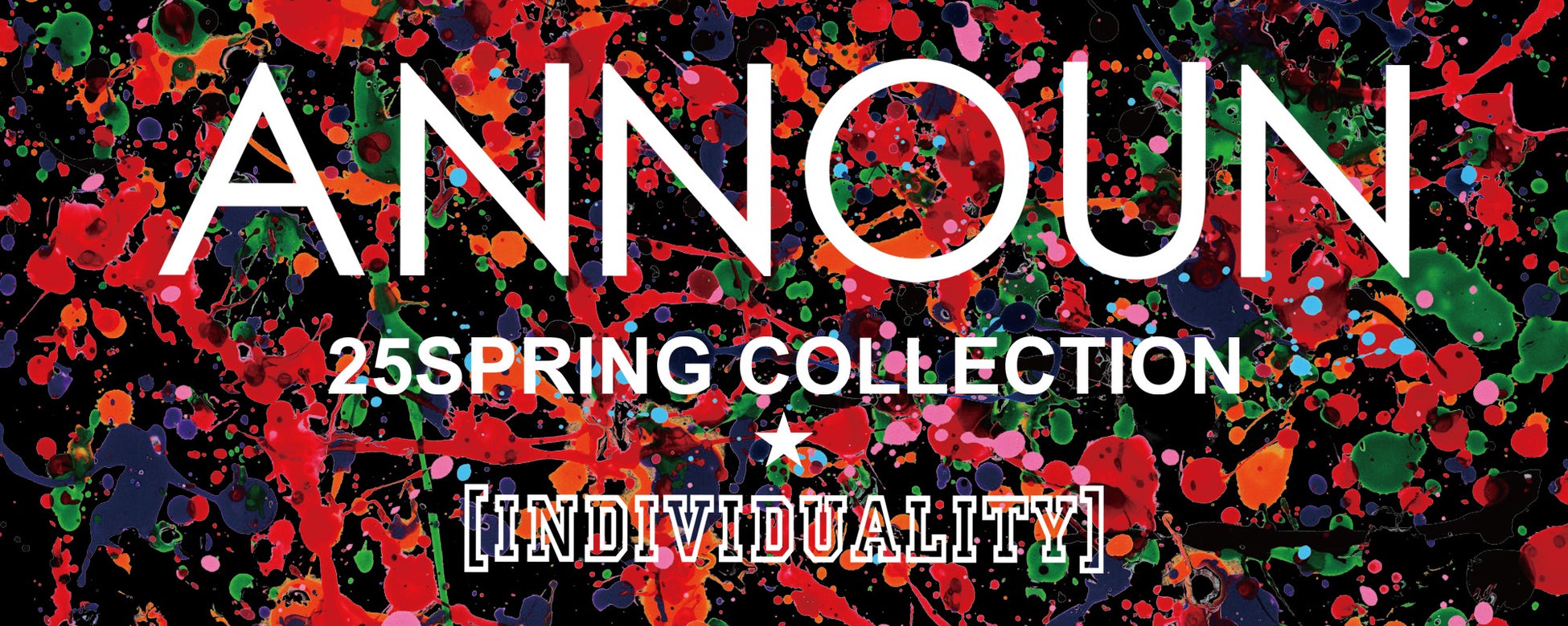 INDIVIDUALITY 「個性」をテーマに、アクションペイントを使った個性豊かなアートや絵画から生まれるデザイン、それぞれの個性が重なりあった作品。Tシャツ(¥6,380税込〜)、スエットシャツ(¥8,580税込〜)、フーディー(¥8,580税込〜)やトートバッグ(¥3,300税込)、ジュートバッグ(¥4,400税込)、小物(¥1,650税込〜)など、アート絵画インテリア(¥9,900税込)も含め約100点の作品を展示します。 「アトリエ・アンノウン」に所属するアーティストたちの個性あふれる原画とデザインでANNOUNの新たな世界感を表現したコレクションになります。