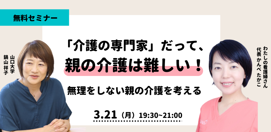研究と介護現場の最前線で活躍する「介護の専門家」と「親の介護」を考えるオンラインセミナー。親の介護に悩む現役世代のみなさま、介護保険外サービスに興味のある介護士・看護師のみなさんの参加を募集中!