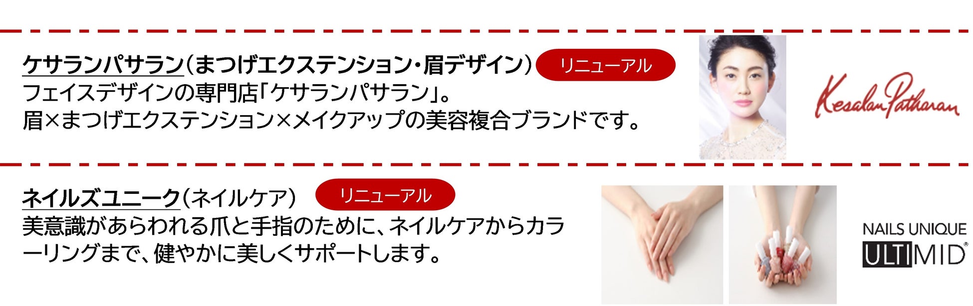 ●時代を反映したコンフォートブランドを導入した婦人肌着売場をはじめ、マタニティ、ジュニア、スポーツ衣料、ビューティーサロン(まつげエクステ・ネイルケア)併設により、幅広いお客様により便利に買い回りを楽しんでいただけるようにリニューアルいたします。また、婦人肌着売場では専門フィッターによるカウンセリング測定サービスなどのイベントも適宜開催し、体型変化によるサイズオーダー需要の高まりにも対応いたします。