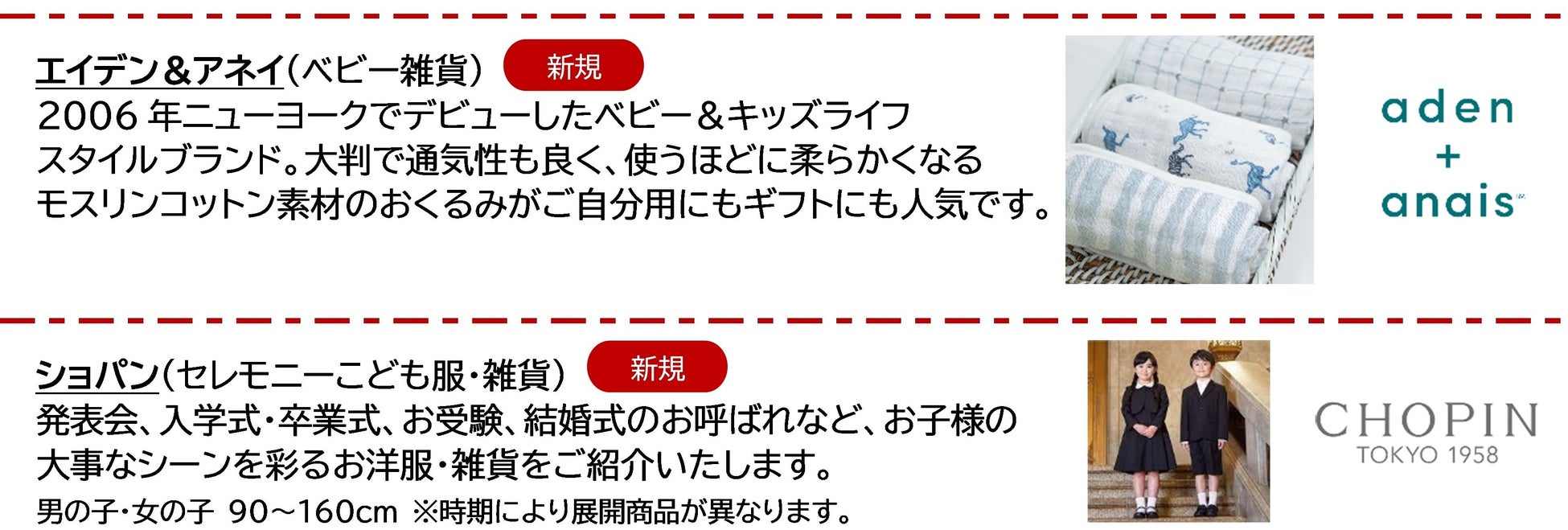 ●ベビーカーや抱っこ紐等の育児用品、上質・イマドキなベビーギフト、お子様のオケージョンに合わせたお洋服や雑貨の品揃えを強化いたします。