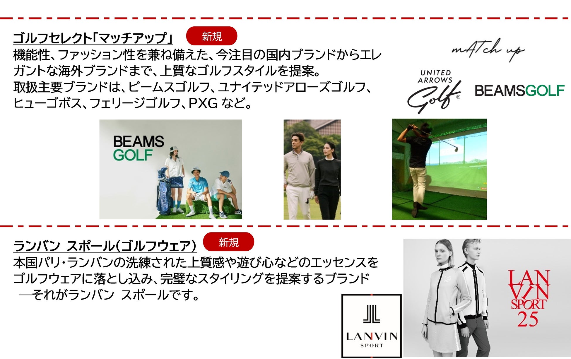 ●人気ブランドのエリア初展開をはじめ、試打室を利用したイベントなどをご用意したゴルフセレクトショップを新設いたします。また、紳士雑貨売場では、トレンドや素材・技術にこだわりのあるバッグ・シューズのほか、ライフスタイルに応える趣味性の高いアイテムのPOPUP展開を行い、遊び要素と変化のある売場を構築いたします。