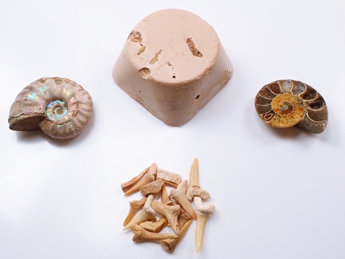 これは、石膏の中に本物のアンモナイトや魚の歯の化石を入れて固めたもので、大地から化石を発掘するワクワク感を手元で気軽に楽しめるようになっています。
