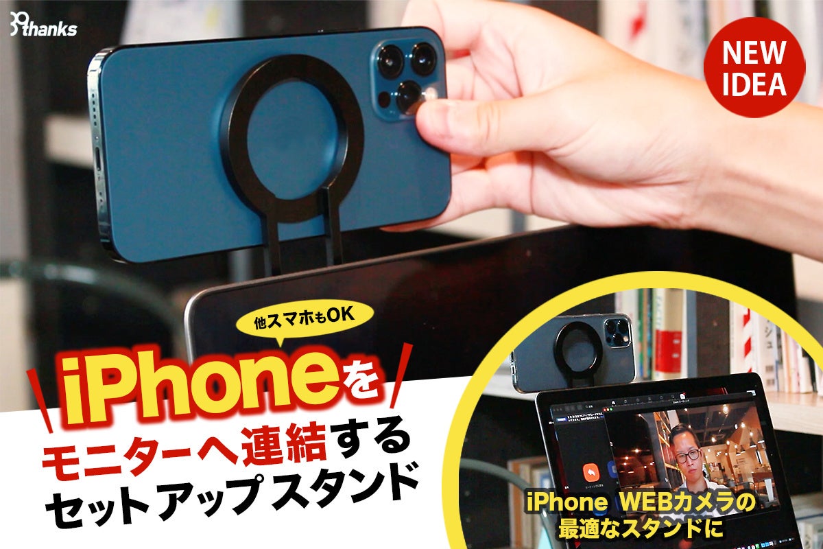 iPhone等のスマートフォンをPCモニターへ連結するホルダー「MAGHO setup stand」が、先行予約販売を開始します。\iPhoneのWEBカメラ機能の最適なスタンドに/