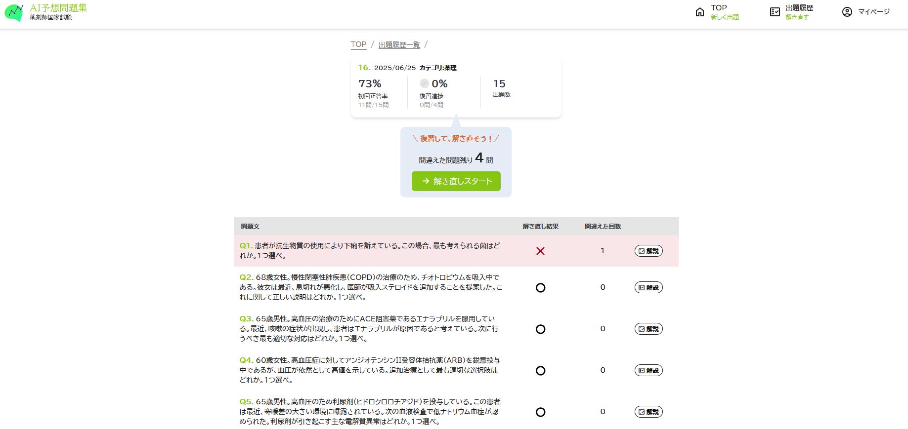 できるまで徹底復習 出題された問題はすべて保存されます。 間違えた問題は後から何度でも復習可能です。