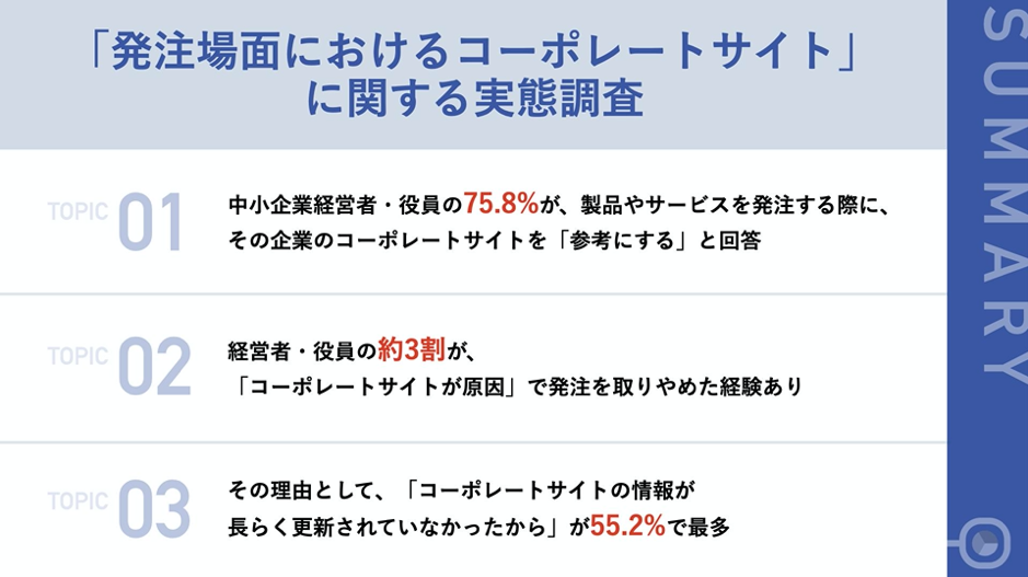 今回の調査では、コロナ禍における取引検討時には、企業のコーポレートサイトの重要性が増していることが判明しました。一方で、コーポレートサイトを保有していれば良いということでもなく、頻繁な情報更新や明確な情報発信が、企業の信用にも直結し、取引がスタートするか否かをも分ける重要な役割を担っているようです。調査内でも、営業・マーケティング活動を見据え、約8割の経営者が、「戦略的に自社のコーポレートサイト制作を行う必要がある」と回答していることからも、取引を開始する上で必要な自社情報を、求めている人に的確にお届けできるように、「伝わりやすい」コーポレートサイトの構築と継続的な自社情報の発信が、コロナ時代を生き抜く企業の必須ツールと言えるでしょう。