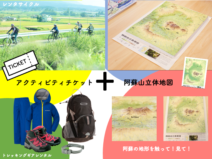 南阿蘇の道の駅あそ望の郷くぎの内「アクテビティセンター南阿蘇」で使えるアクテビティチケット(ペア)と阿蘇外輪山も含めた阿蘇山全体を立体でおこした「阿蘇山立体地図」のセットです。