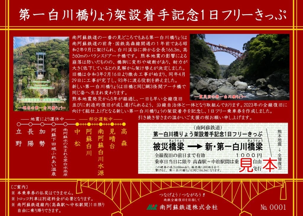 白川渓谷にかかる「第一白川橋りょう」は高さ60mの鉄橋で、2016年4月に発生した熊本地震の被害を受けて2021年4月末に撤去されました。 南阿蘇鉄道の一番の見どころでもあるこの橋りょうは、今年1月より新しい橋りょうの架設工事が始まり、南阿蘇鉄道の全線復旧へ向けての大きな一歩となりました。この架設着手を記念した「第一白川橋りょう架設着手記念1日フリーきっぷ」です。