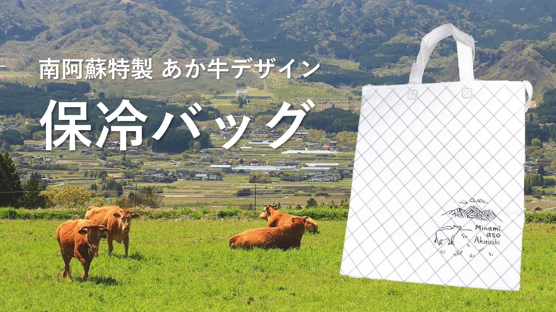 阿蘇の雄大な草原で放牧されてすくすくと育つあか牛をデザインした、特製の保冷バッグ。お肉の大きなトレーも平置きできるサイズで、再利用できるエコなバッグです。南阿蘇でお肉やお野菜、お弁当を買って、BBQやピクニックに出かけてみませんか?