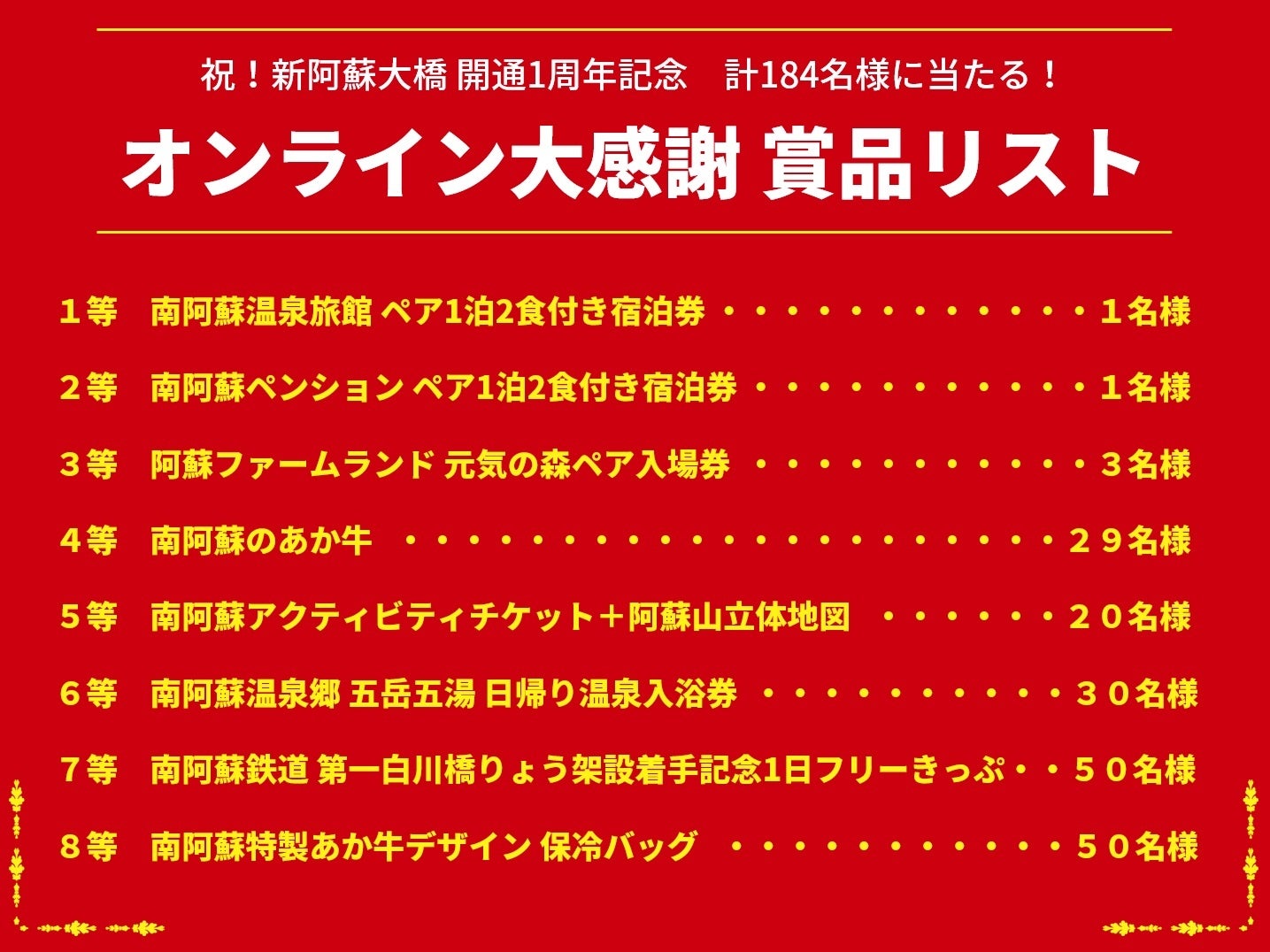 そんな皆様への感謝を込めて、この度、「オンライン大感謝祭」を開催いたします。WEBフォームよりアンケートにお答えいただくことで、温泉旅館宿泊券やアクティビティチケットなど南阿蘇をもっと楽しめる賞品が橋(84)にちなんで計184名様に当たります。