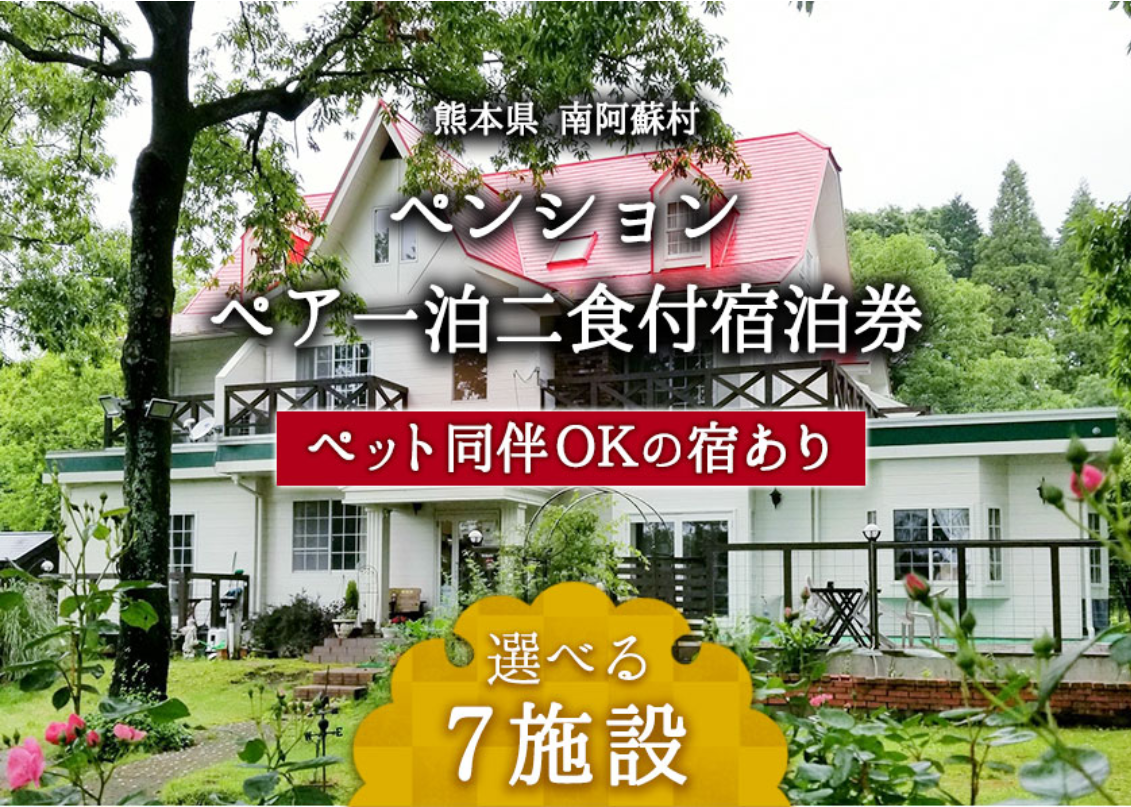本宿泊券にて、フレンチのフルコースが楽しめる、大切なペットと一緒に泊まれるなど個性豊かなペンション全7軒からお好みの宿を選びご宿泊いただけます。南阿蘇の豊かな恵みを、ペンションならではのおもてなしとともにご堪能ください。