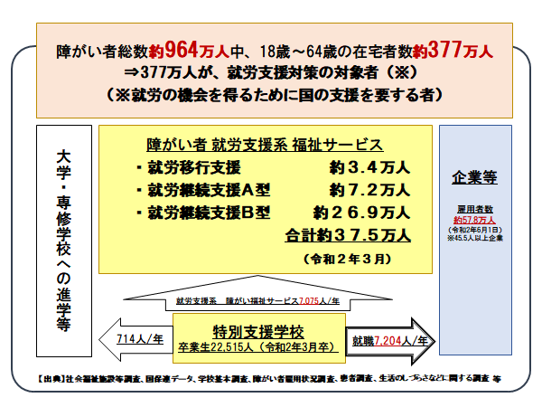 厚生労働省発表の令和4年の「障がい者 雇用状況」によれば、「民間企業の雇用障がい者数は 61 万 3,958.0 人で、過去最高を更新」とあります。一方で、「障がい者の総数は964.7万人で人口の7.6%に相当する」とありますが、その中でも18歳から64歳までの「就労支援施策」の対象者(働きたくても働く場所が無い、障がい者等のために国が要する施策の対象者)の数が377万人なのに対し、令和2年3月時点の「就労支援系、障がい福祉サービス」利用者は約37.5万人であり、「就労支援施策」対象者の1割にも満たない現状です。