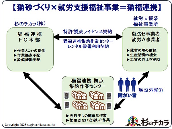 ペットヘルスケア用品「杉にゃん」を開発する杉のチカラ株式会社は、特許製法の「オーガニック猫砂」の製造のプロセスで障がい者の就労を支援し、高工賃、設備投資ゼロ!を実現する新スキームをリリース致しました。