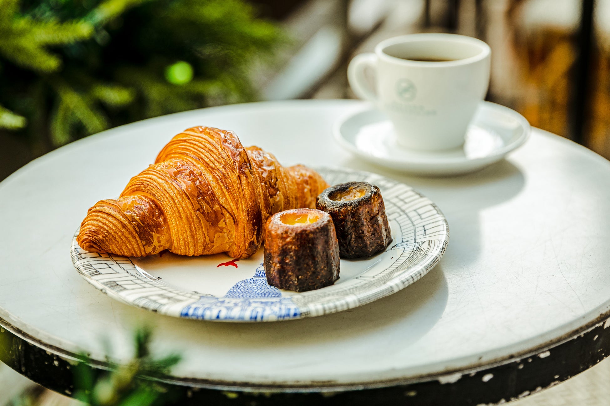 麻布台本店では、クロワッサン フランセとカフェラテ、カヌレーヌの組み合わせが定番人気。またカフェラテにクロワッサンを軽く浸す、フランスの定番スタイルも楽しめます。