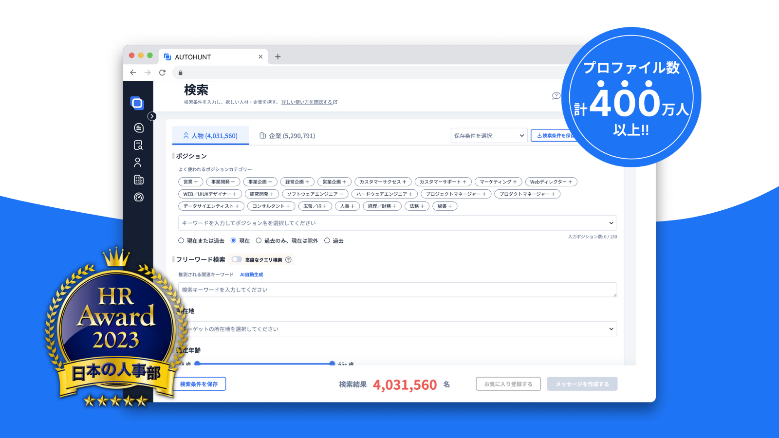 なお、「AUTOHUNT」「AUTOBOOST」の基盤となる当社の独自データベースには、すでに500万社以上の企業情報、400万人以上の人物プロファイルを構築しています。特に、人物プロファイル数は年間約100万件程度の拡張スピードで成長しており、人物データ量については業界最大級のプラットフォームに成長しました。