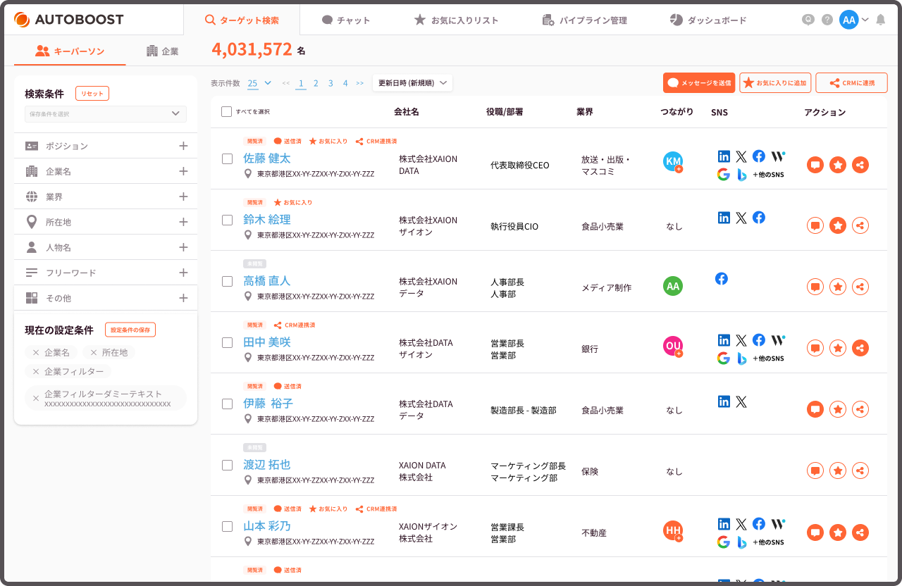 新サービス「AUTOBOOST」は、ウェブ上のオープンなSNSやメディアに掲載された人材および企業の情報を収集・統合し、膨大な情報の中から横断的に企業・キーパーソン検索が可能なAIセールスプラットフォームです。