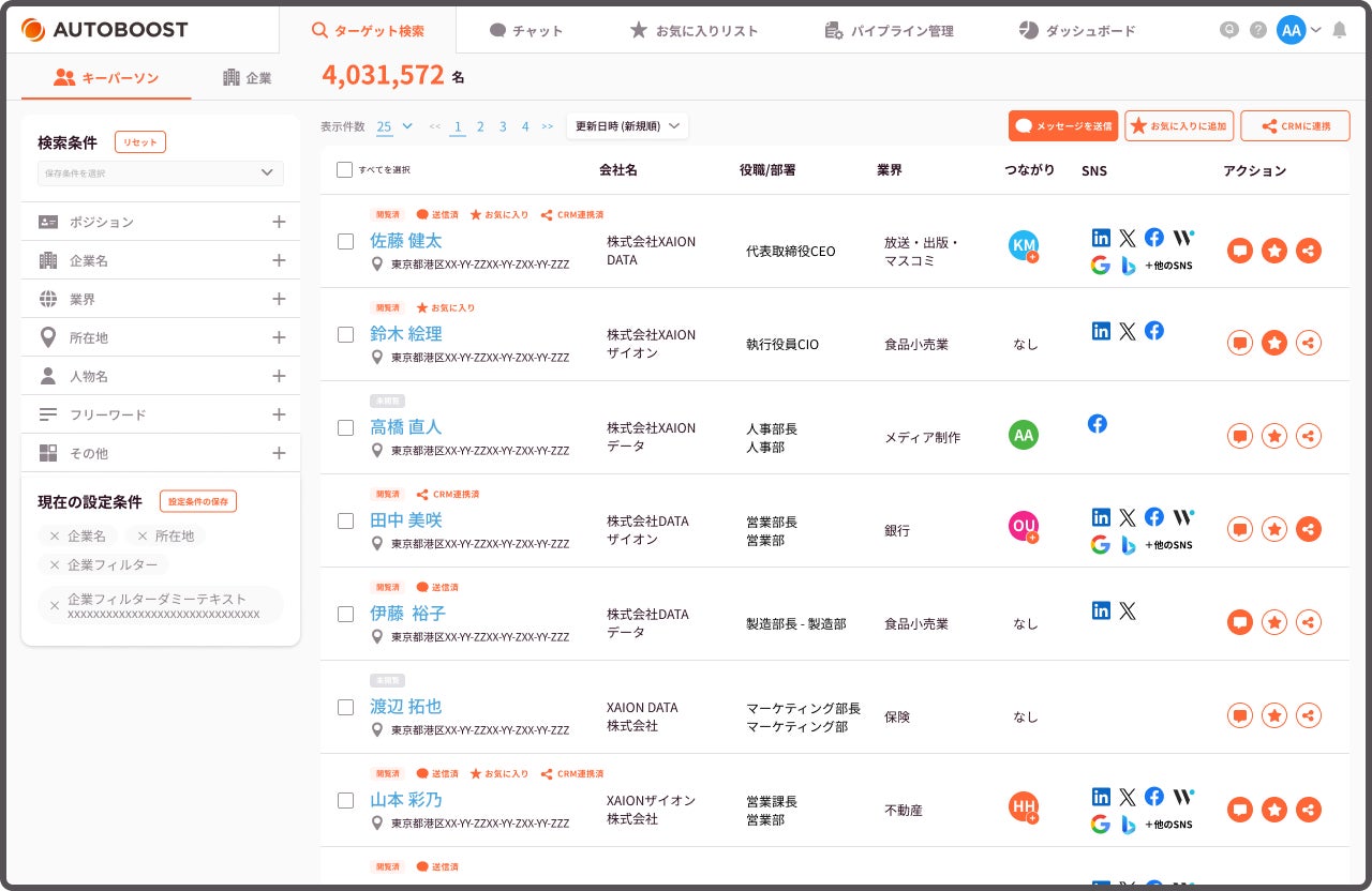 「AUTOBOOST」では、ウェブ上の公開されているキーパーソン情報を検索できるだけでなく、キーパーソンへのSNS上でのアプローチを自動化でき、企業リスト作成からターゲットアカウントの絞り込み、キーパーソンアプローチまでをワンストップで実現し、ラストワンマイルのキーパーソンアプローチを可能にすることで、営業活動を効率化し売上拡大を加速させます。