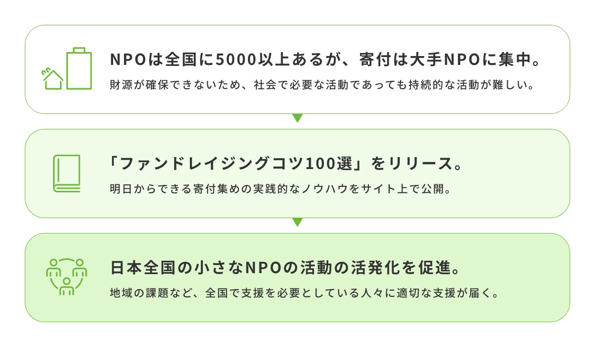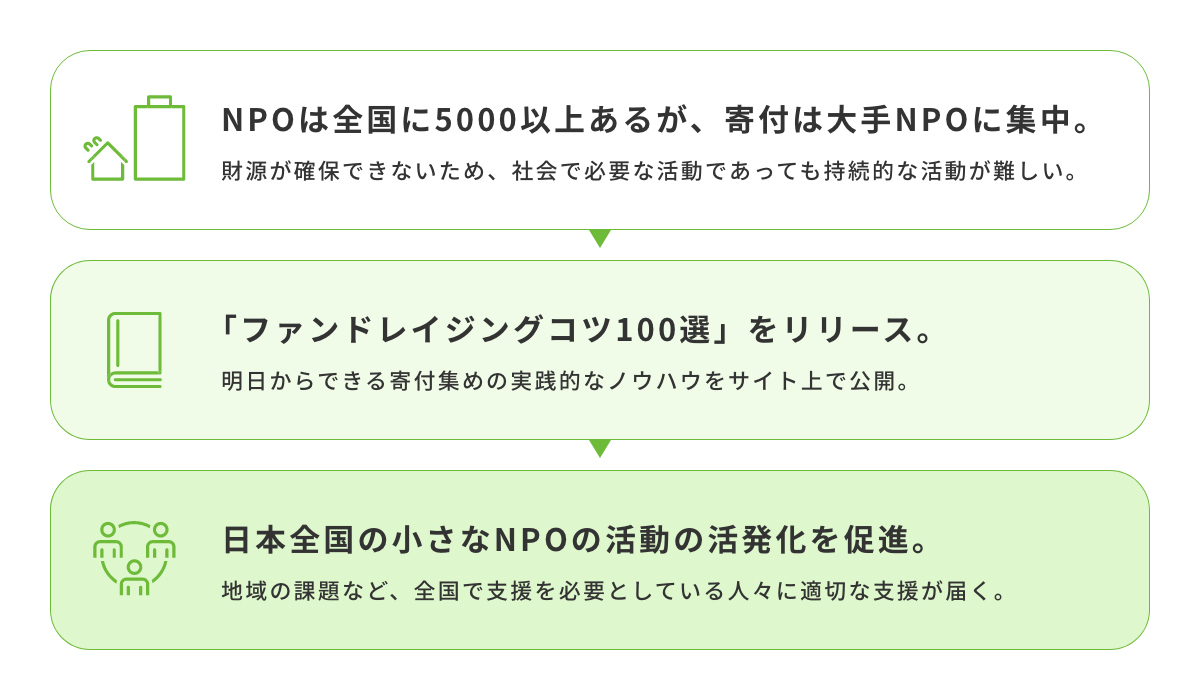 経験や知名度がある大手NPOに寄付が集中する一方、小さなNPOは広報やファンドレイジングのノウハウが少なく、どうやって寄付を集めたらいいか分からない。そんな課題を、1000団体以上のNPO・非営利団体をサポートしてきた中で見てきました。