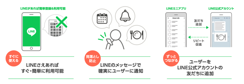 エンドユーザー様は、新しくアプリをインストールする必要はなく、LINEホーム画面からご利用いただけます。(※ご利用の際は当社が提供する「LINEミニアプリオプションサービス」へのお申し込みが必要となります。)