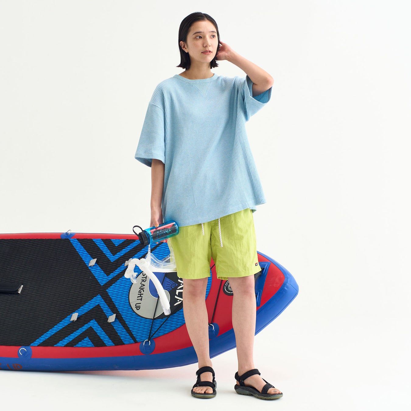 撥水加工を施したナイロンタッサー生地を用いたイージーショーツから新色が登場。街ではもちろんのこと、スイムショーツとしても着用できる1枚となっている。同素材のシャツとセットアップで着用するのもおすすめ。