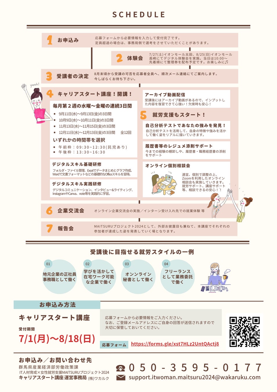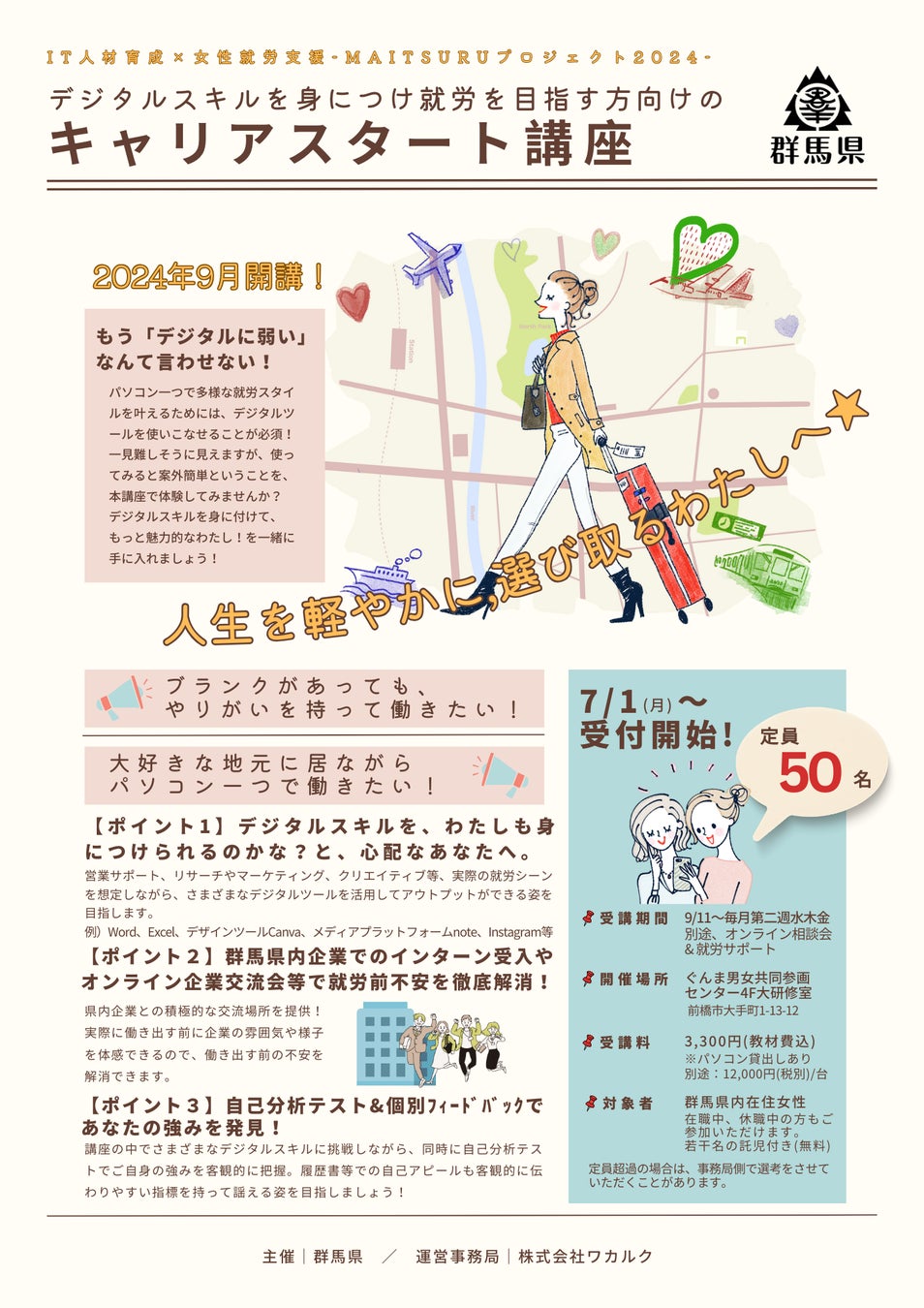 MAITSURUプロジェクトは、出産や子育て等で離職している女性や、非正規雇用から正規雇用を目指す女性に向けて、デジタル技術を活用できる女性人材の育成から就労までを一体的に支援する、群馬県産業経済部労働政策課によるプロジェクトで、2024年度は、キャリアスタートコース1講座、キャリアアップコース2講座の計3講座が開講されます。