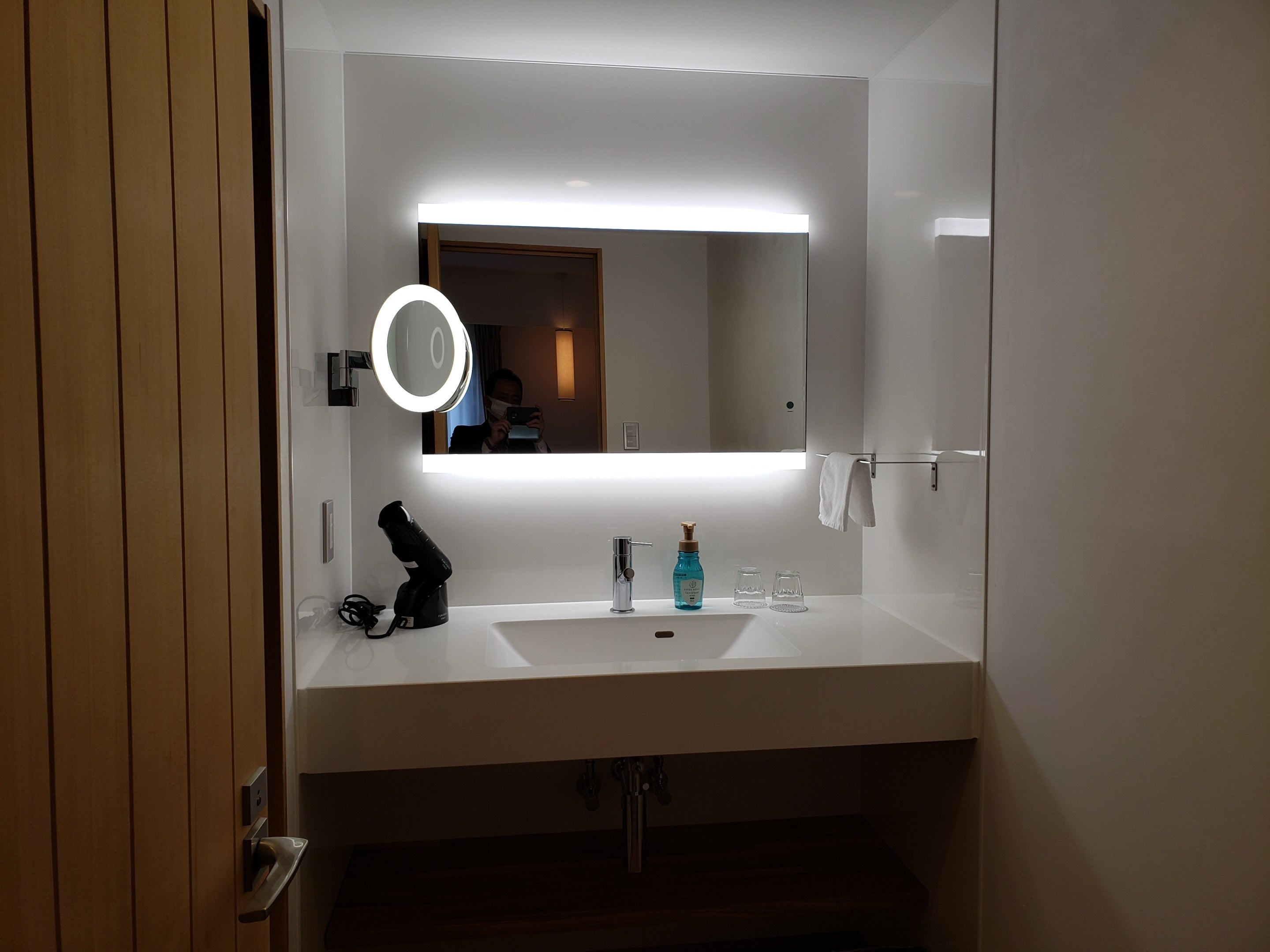 □拡大鏡もある広々とした独立した洗面台で身支度を整えていただけます。