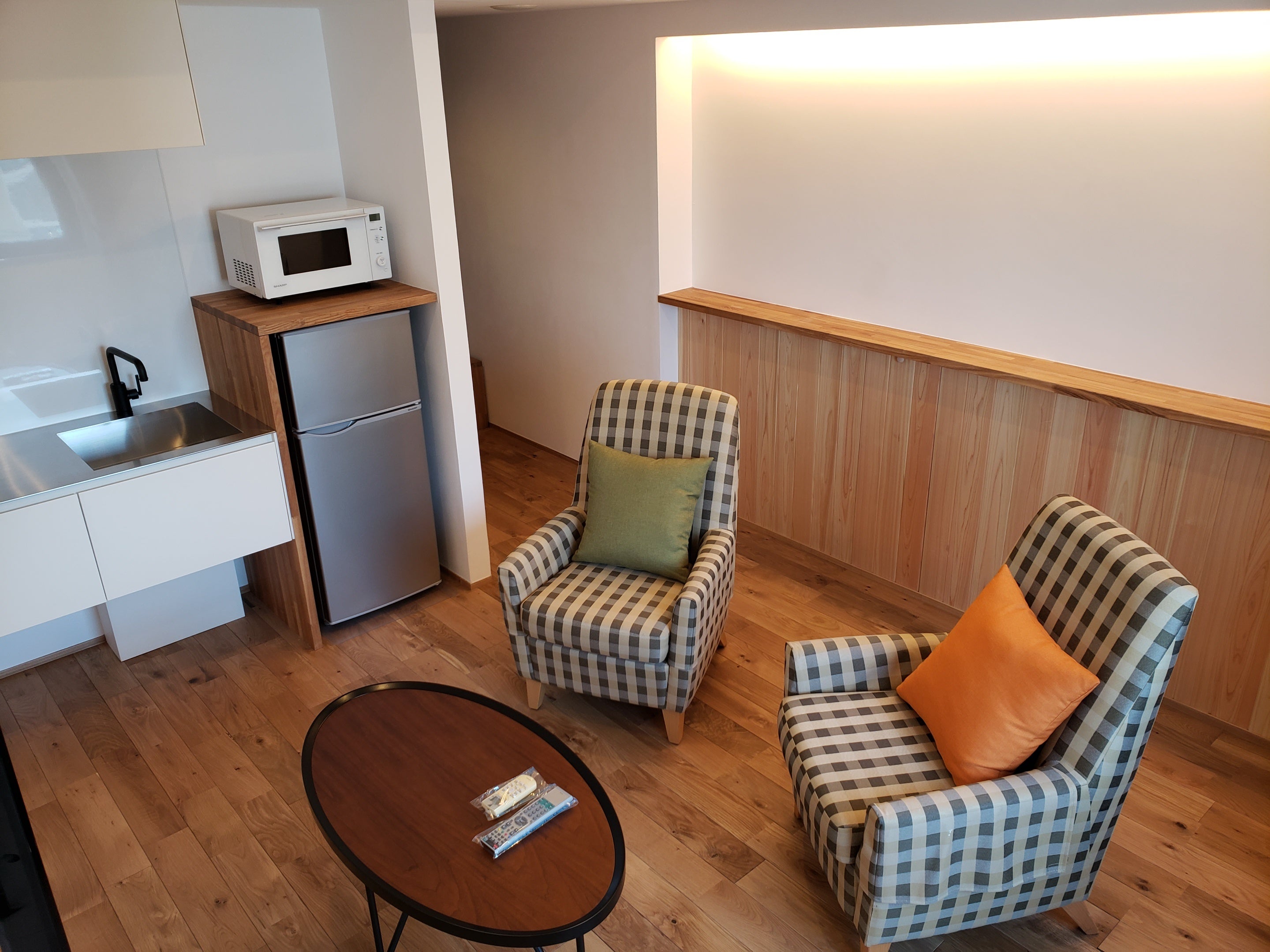 □電子レンジと冷蔵庫、簡易キッチンを備えており長期滞在も快適です。