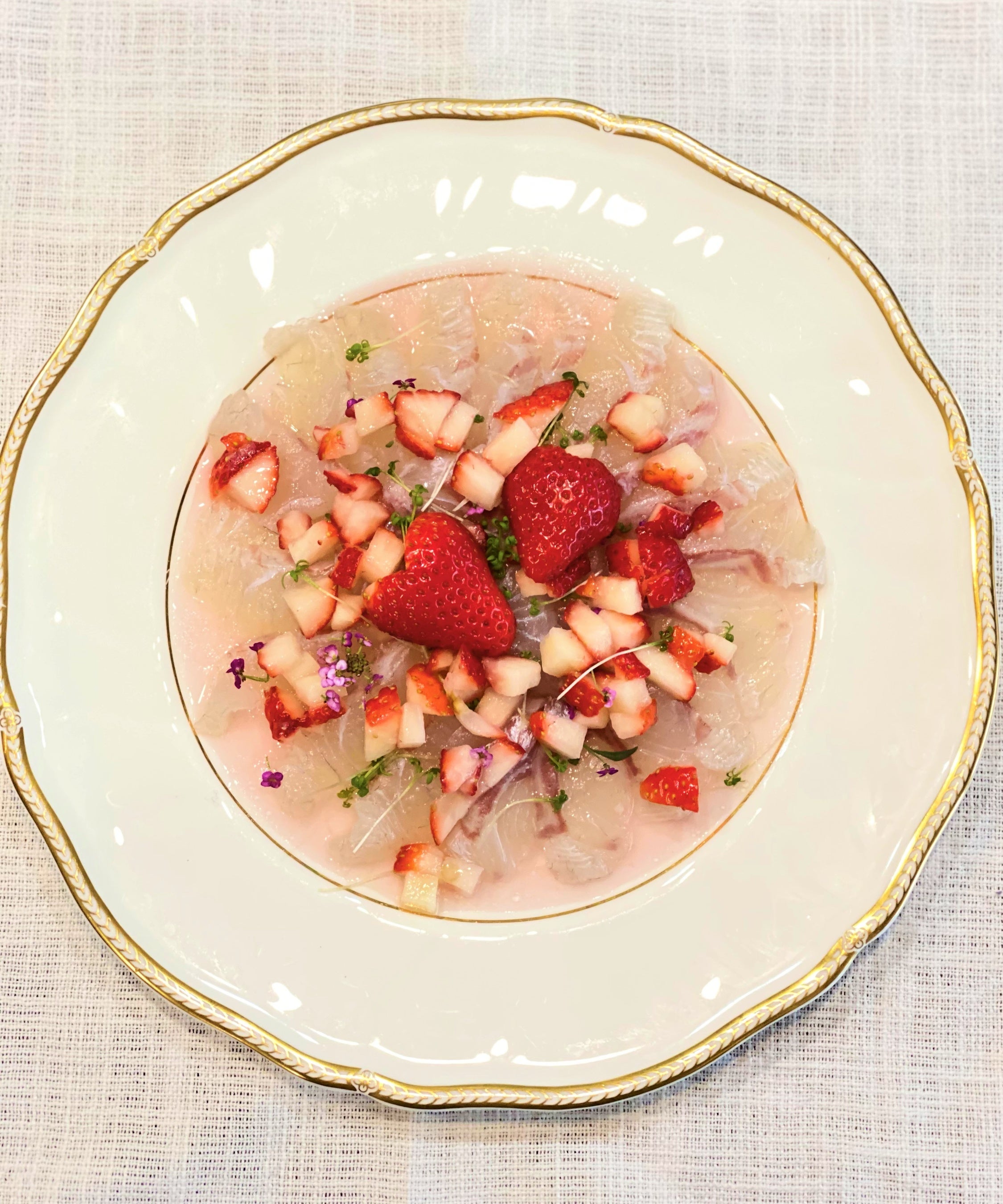 今回のレシピでフルーツと生魚の組み合わせに驚かれる方も多いと思いますが、酸味のあるフルーツと旨味(甘味)のある真鯛とその両方を上手く取り持ってくれる桜ドレッシングを使用することによって、想像のつかないような新しいお料理になります。
