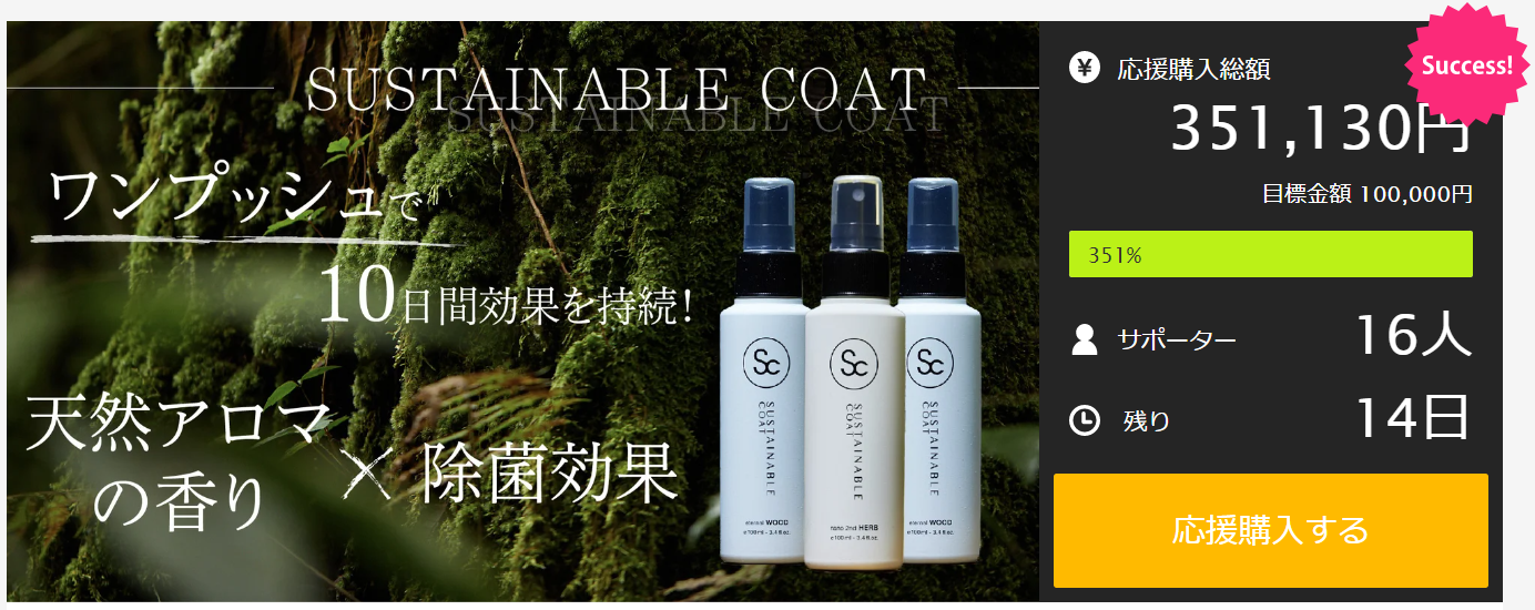 【目標金額300%突破!】天然精油の香りと10日間続く除菌効果を発揮する、光触媒を原料にしたファブリックミスト『Sustainable Coat®』 応援購入サービス「Makuake」にて好評販売中