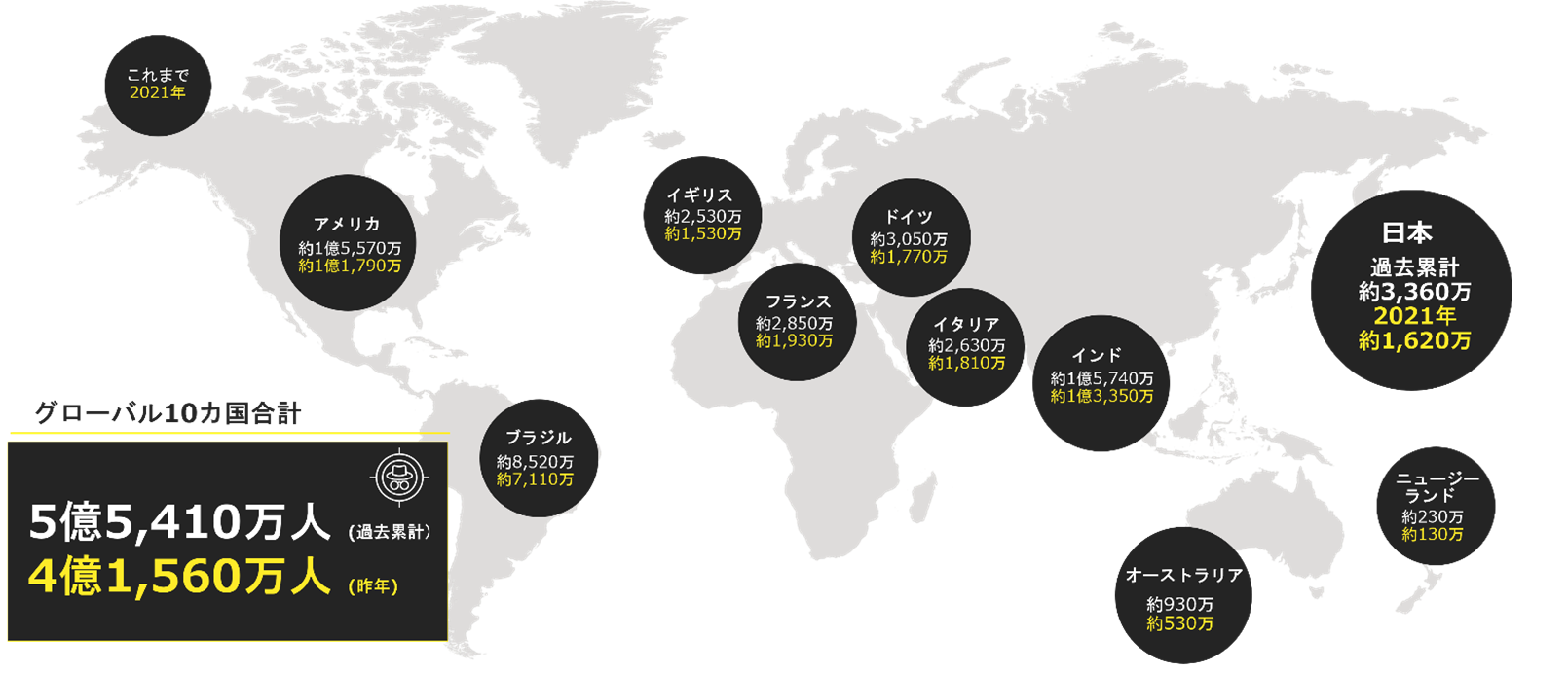 ●過去1年間(2021年)、日本では推定合計1,620万人の消費者*1が何らかのサイバー犯罪を経験。調査対象の10ヶ国*2全体では推定合計4億1,560万人がサイバー犯罪を経験