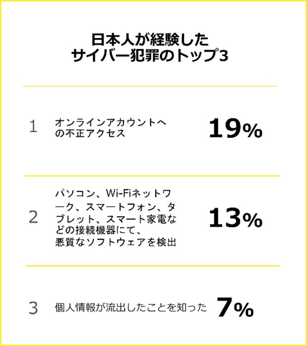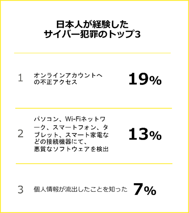 日本の消費者が最も多く経験したサイバー犯罪は、アカウントへの不正アクセス(19%)でした。また、約10人に1人が、コンピューター、Wi-Fiネットワーク、スマホ、タブレット、スマート家電、その他の接続機器に悪意のあるソフトウェア(スパイウェア、ランサムウェア、ウイルス、ワーム、トロイの木馬、アドウェアなど)を検出した(13%)、あるいは個人情報が流出したことを知った(7%)、と報告しています。