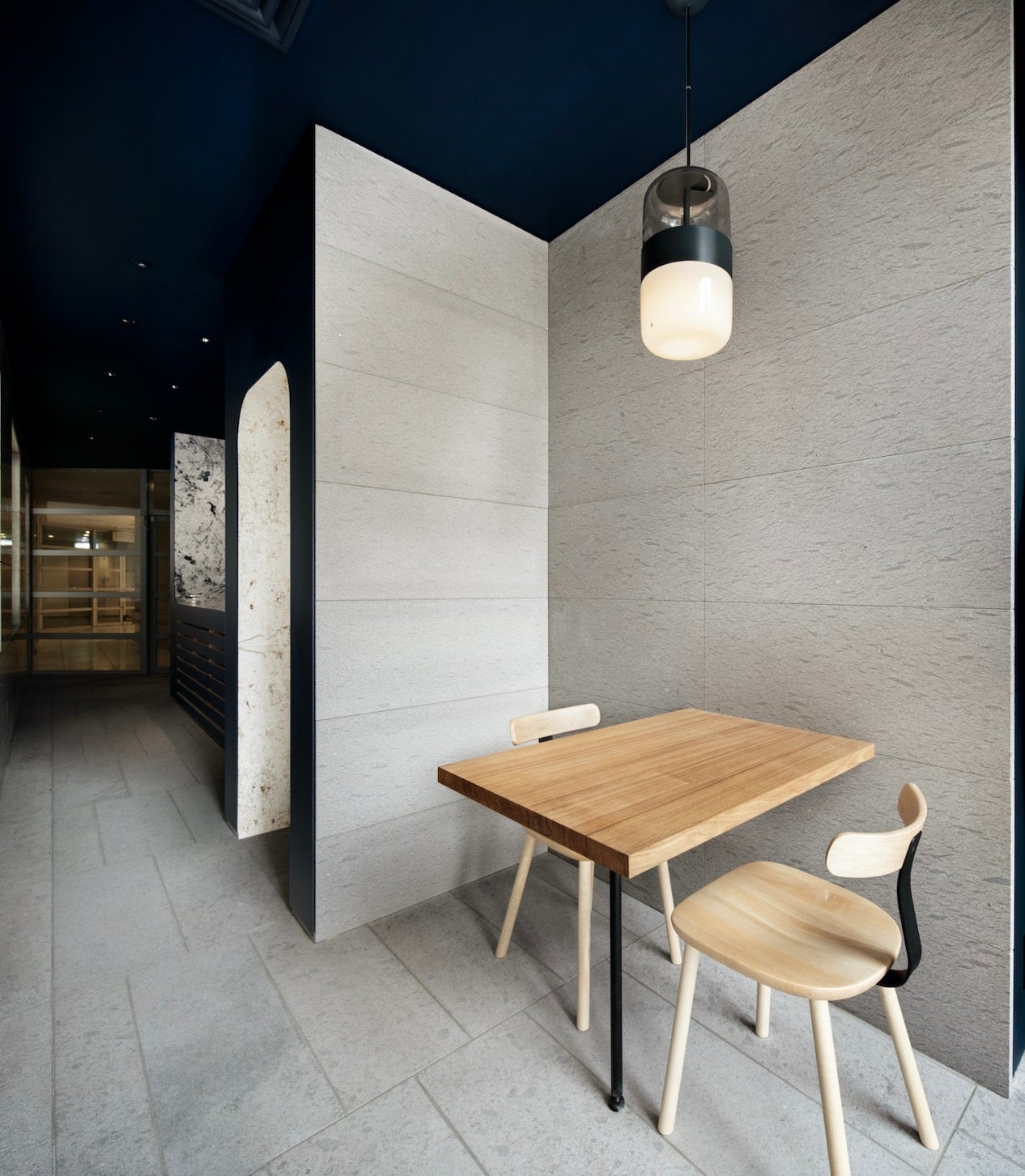 床に板目、パーティションに柾目の薩摩石を貼り分けた「STONES東京」